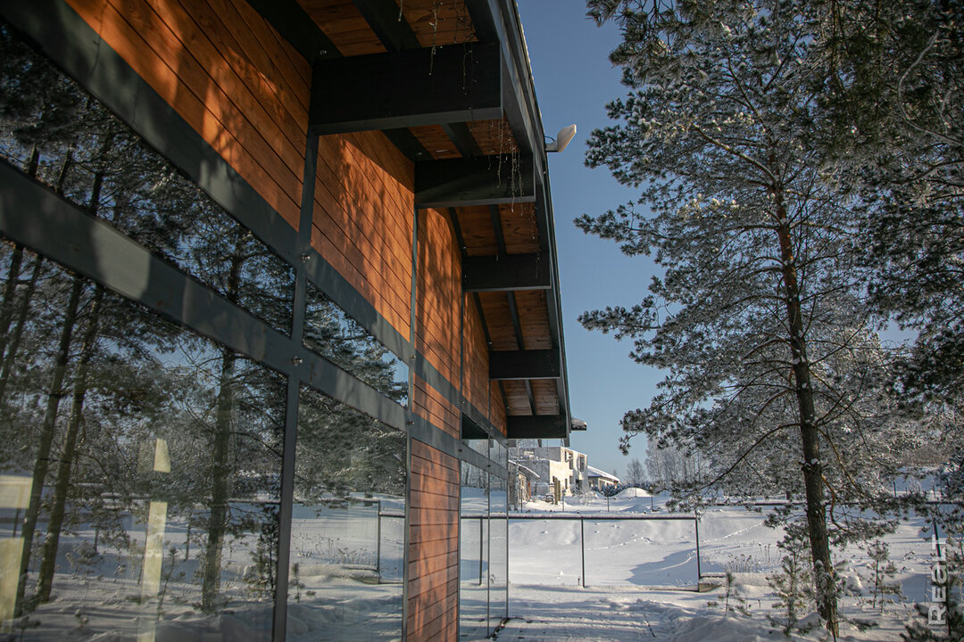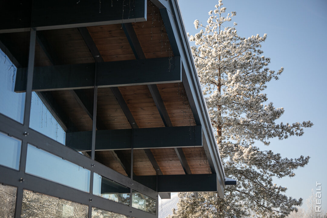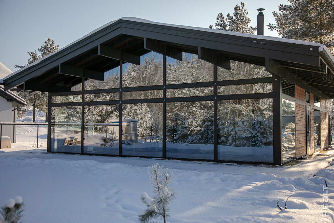 Несмотря на большой объем стеклянных стен (около 70%), мы видим и глухие стены. Для их утепления использовался PIR-утеплитель, он значительно эффективнее каменной ваты. Материал плитный, жесткий, монтируется между стоек каркаса на полиуретановый клей. Под фасадной обшивкой и внутренней отделкой находится 100 мм PIR. Крыша также утеплена PIR, но толщиной 120 мм, что соответствует 350 мм минваты. Сверху зашита сплошным основанием из OSB-плит.