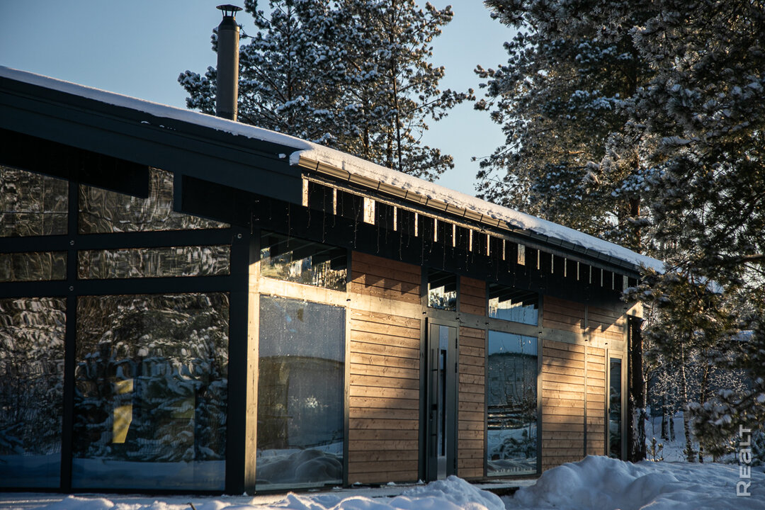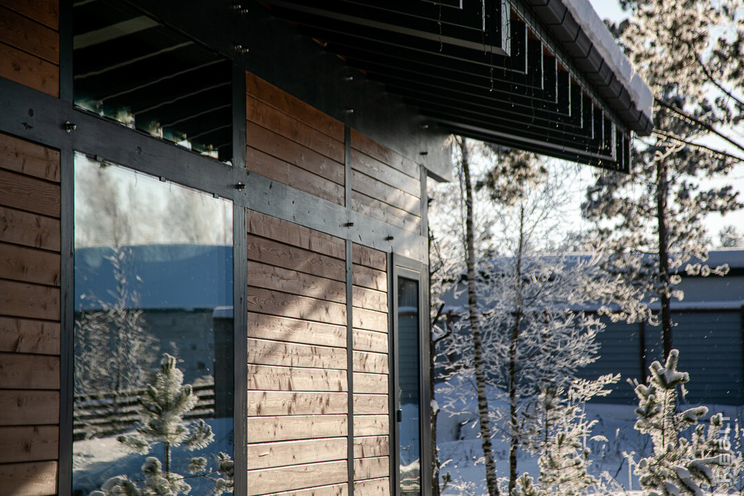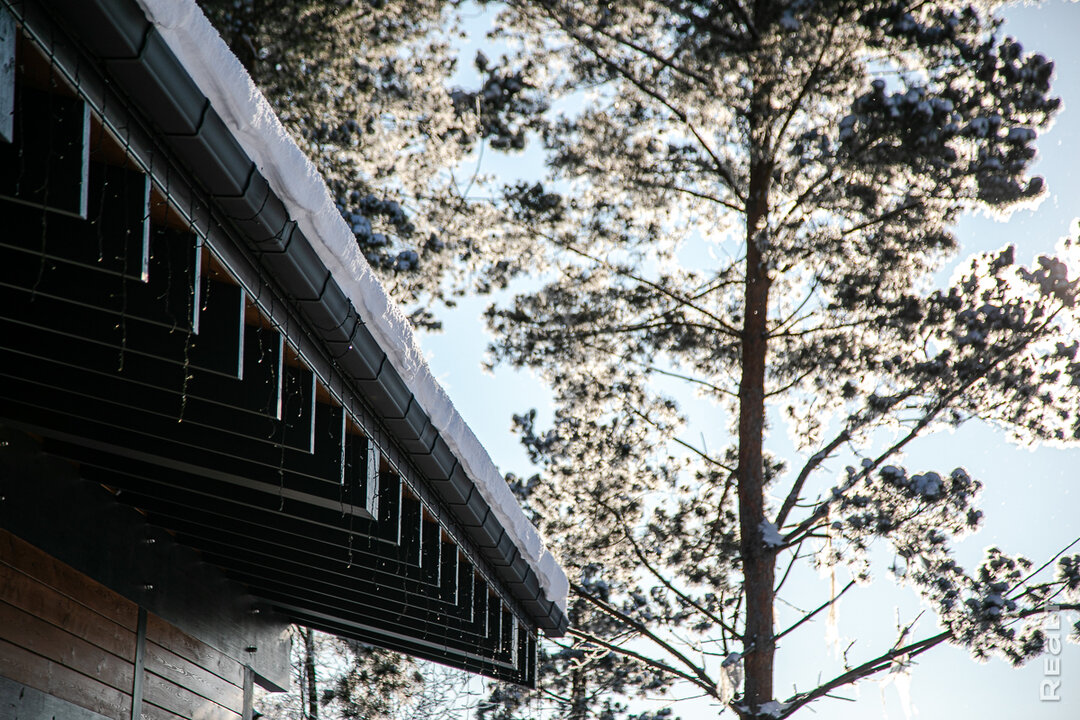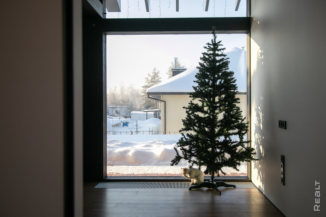 Лучшего времени для съемок фахверкового дома не бывает: солнце, минус 20, сугробы, шапки снега на елках и соснах, лес напротив скрипит и искрит от мороза. И вся эта красота отражается в панорамных окнах — выглядит все нереально, как будто над картинкой поработала «аишка». Но своим глазам придется верить — все так и есть.