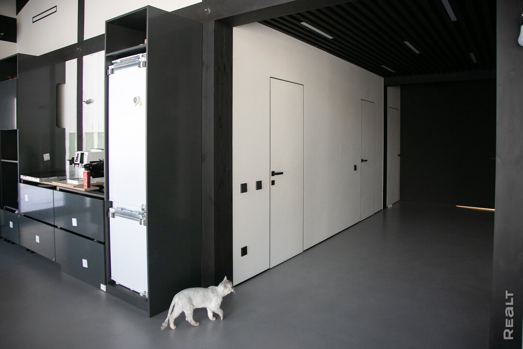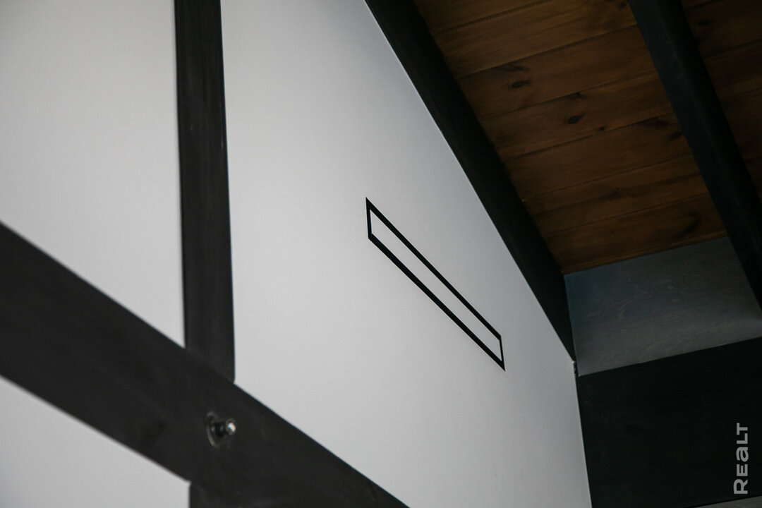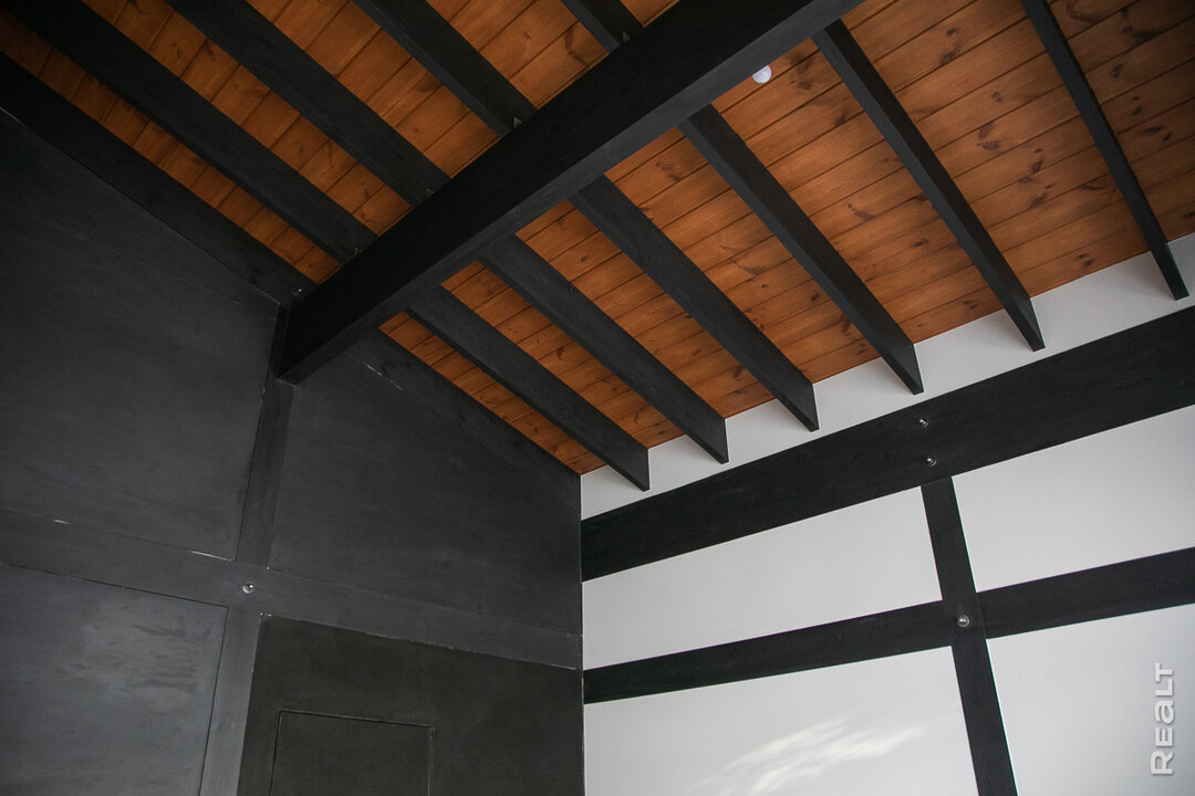 Дом Александра одноэтажный, но внутренне пространство организовано весьма своеобразно. Например, над зоной гостиной, кухни, в спальнях и кабинете, потолки высокие, скошенные, повторяют наклон крыши. Силовые деревянные элементы в виде балок и стропил являются частью интерьера. В центральной части дома, где расположены прихожая, коридор и санузел, потолок понижен. Это неспроста — над этой частью находится функционально задействованное чердачное помещение.