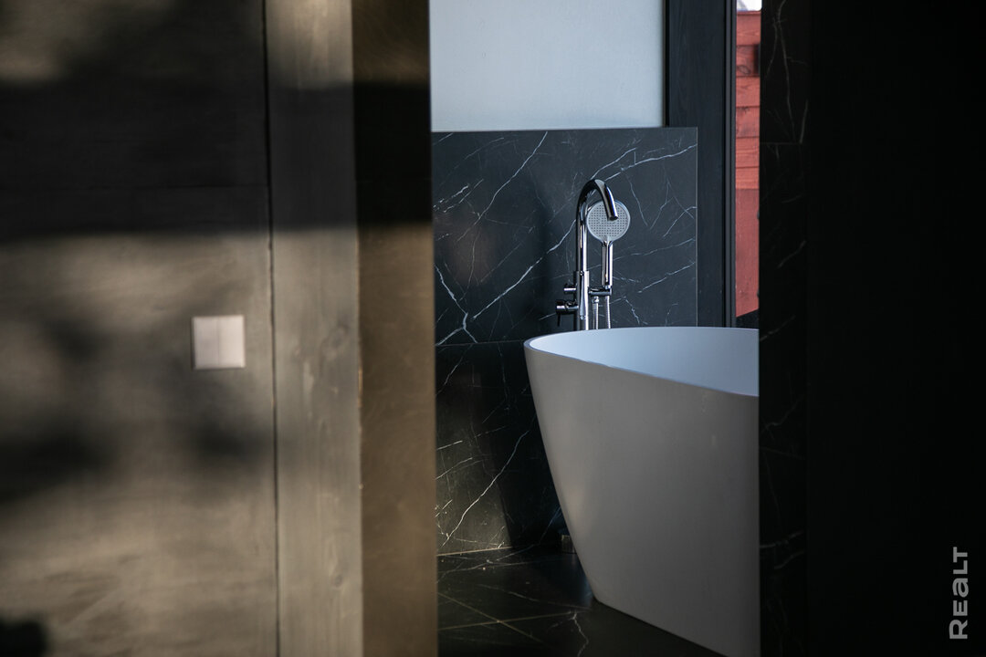 Общая площадь дома 150 квадратов. Налево из прихожей попадаем в гостиную-кухню с камином на дровах. Направо — приватная часть дома, в которой находим кабинет, детскую и мастер-спальню с собственным санузлом и ванной прямо у панорамного окна (такие же прозрачные стены и в остальных комнатах).
