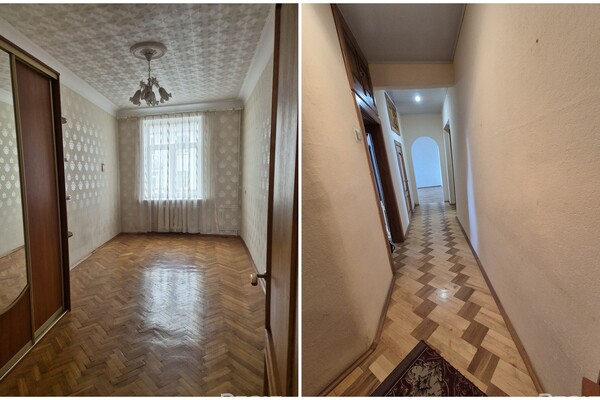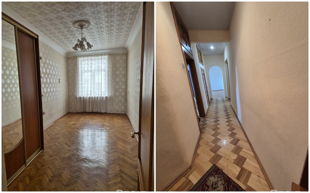 Вторая квартира — трешка на четвертом этаже. Ее площадь — 88,5 м². На кухню выделено 14 квадратов. Жилье тоже с духом того времени: высокими потолками, паркетом на полу, розетками на потолке и арочными проемами. Окна в кухне и одной комнате выходят во двор, остальные смотрят на улицу Карла Маркса.