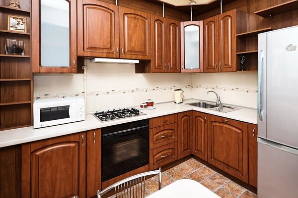 Остается тут и кухонный гарнитур со всей необходимой техникой: холодильником Liebherr, газовой плитой и духовым шкафом Hotpoint Ariston.