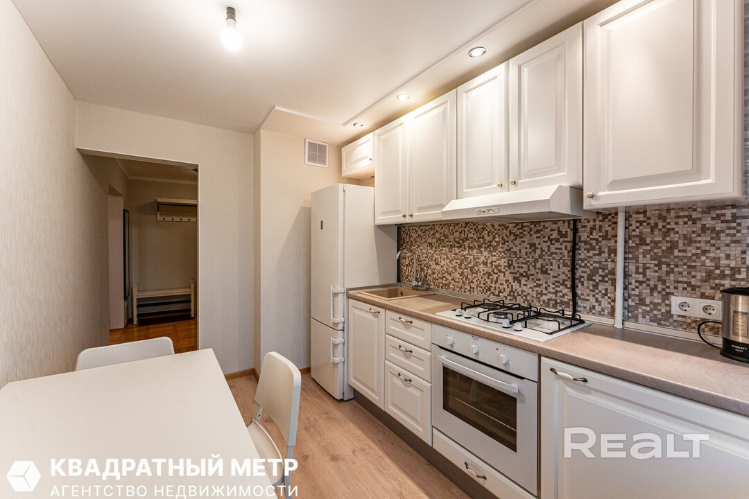 Самая дорогая квартира выставляется по адресу Максима Танка, 10. Это пятикомнатная квартира площадью 104,9 м² находится на третьем этаже. Кухня и гостиная тут объединены. Остальные комнаты — три детские и одна хозяйская спальня. В жилых комнатах на полу лежит паркет, а санузлы облицованы плиткой.