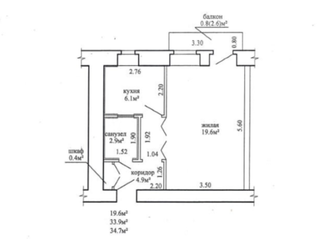 Сейчас здесь продается однокомнатная квартира на четвертом этаже. Она занимает 33,9 м². На кухню выделено 6,1 м².