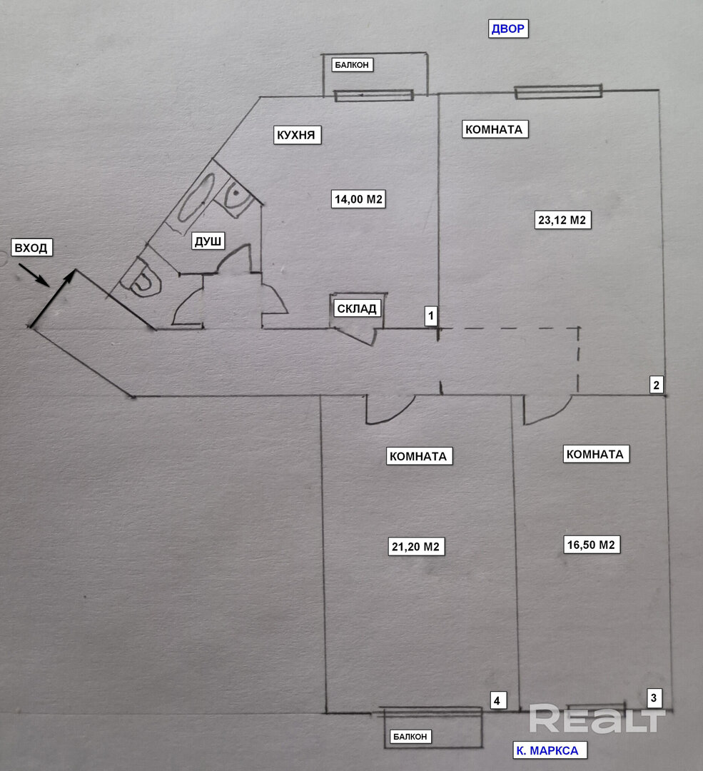 Вторая квартира — трешка на четвертом этаже. Ее площадь — 88,5 м². На кухню выделено 14 квадратов. Жилье тоже с духом того времени: высокими потолками, паркетом на полу, розетками на потолке и арочными проемами. Окна в кухне и одной комнате выходят во двор, остальные смотрят на улицу Карла Маркса.