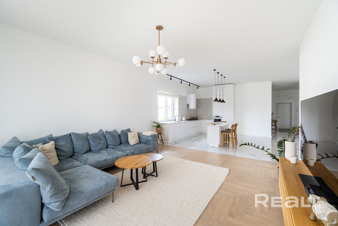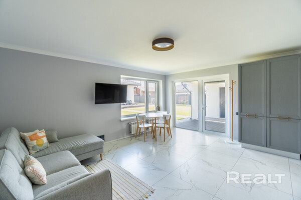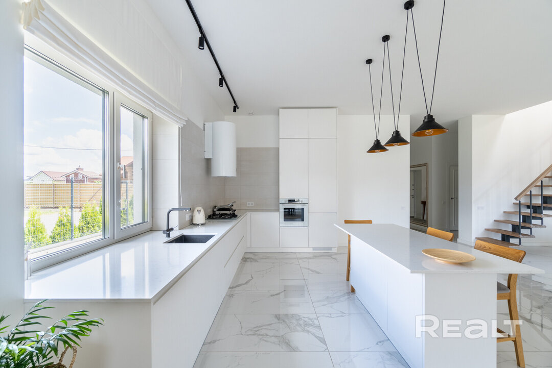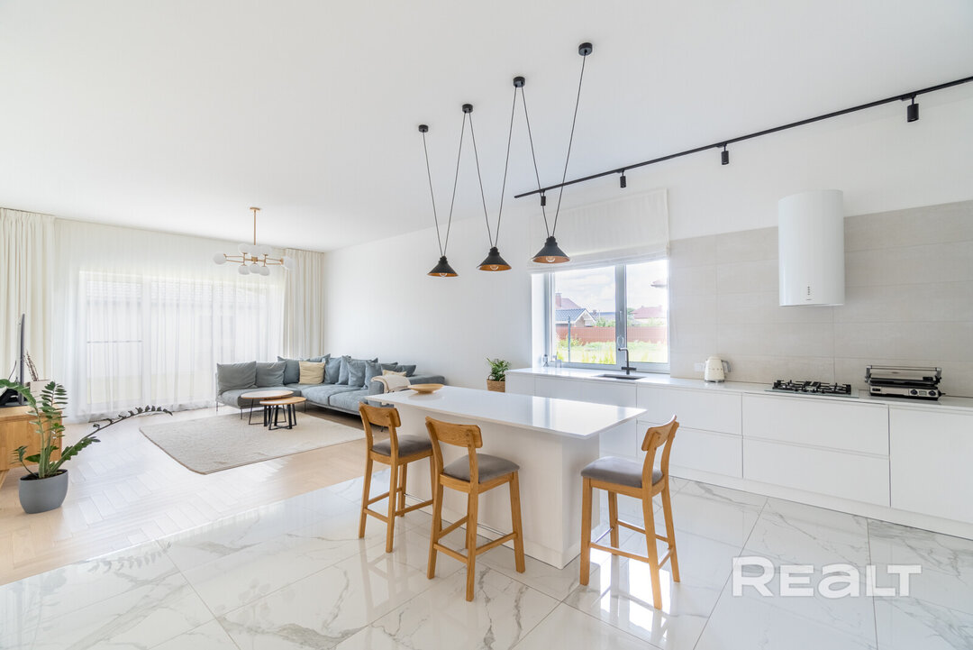 Внутри дом выглядит стильно. За счет светлой отделки и больших окон пространство кажется легким и воздушным. Самая большая комната — совмещенная кухня-гостиная в 66 квадратом. Она состоит из большой кухонной зоны, столовой и ТВ-зоной с диваном.