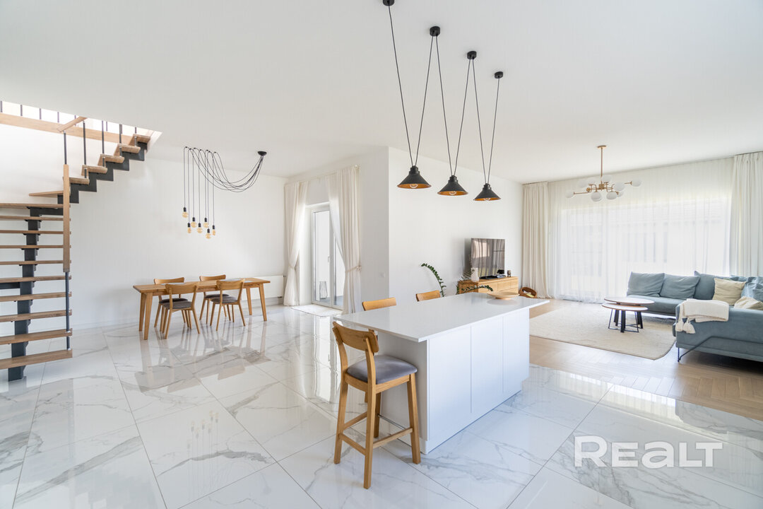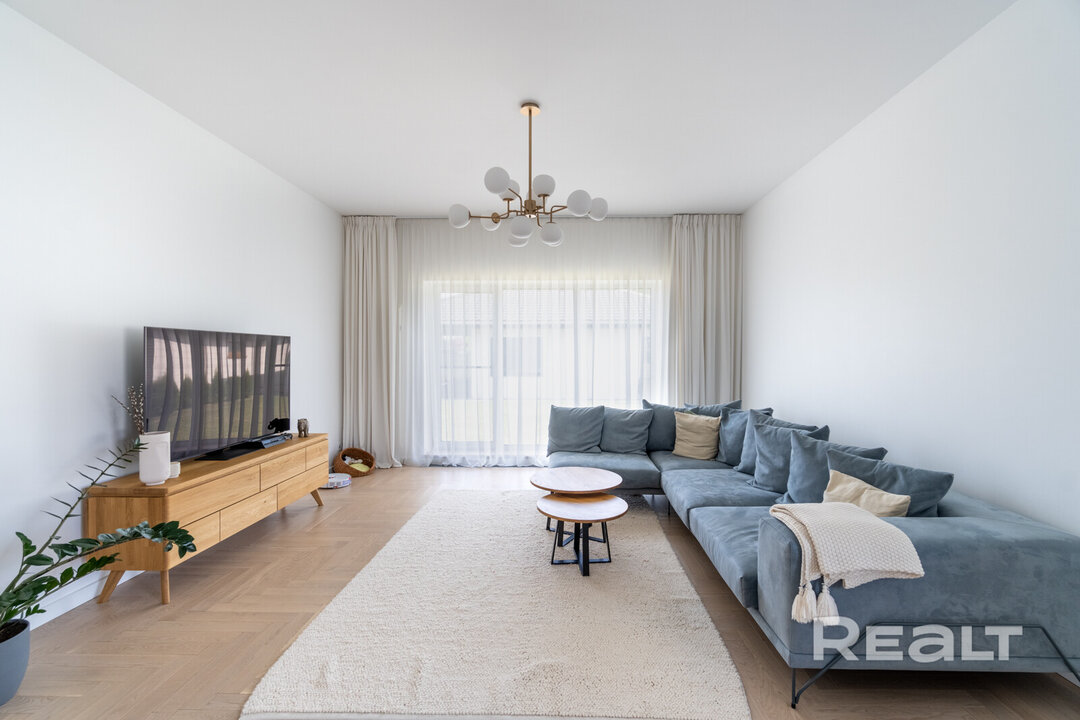 Внутри дом выглядит стильно. За счет светлой отделки и больших окон пространство кажется легким и воздушным. Самая большая комната — совмещенная кухня-гостиная в 66 квадратом. Она состоит из большой кухонной зоны, столовой и ТВ-зоной с диваном.