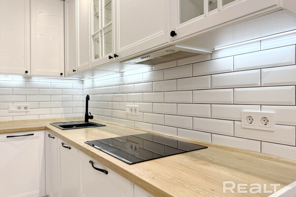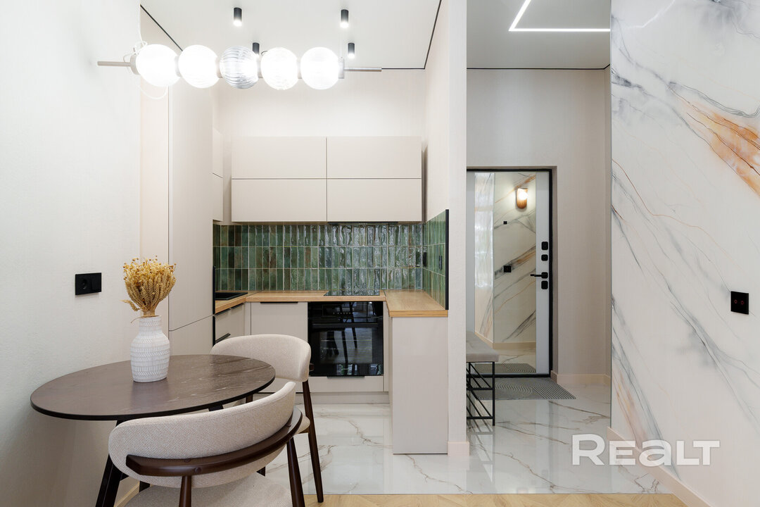 Сделан стильный ремонт. Интерьер выполнен в молочных оттенках. В кухонной зоне яркий акцент — кухонный фартук, выложенный плиткой глубокого зеленого цвета.