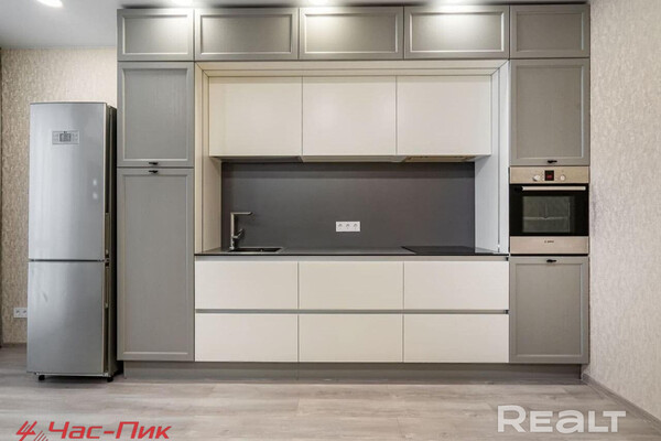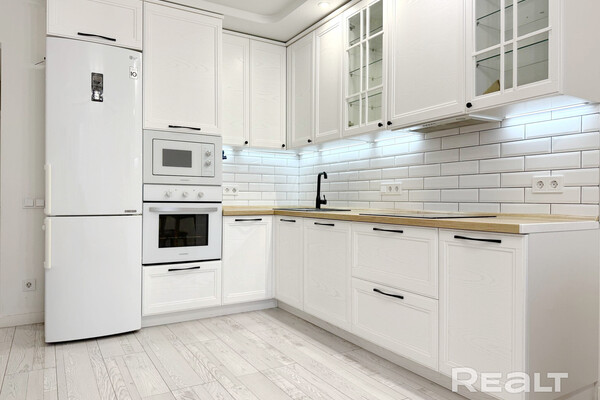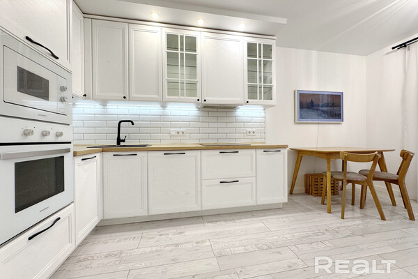 Во всей квартире, включая детскую комнату, светлый интерьер. На полу уложен ламинат Terhurn. Кухня выполнена из массива ясеня. Из техники есть индукционная варочная панель Bosch, духовой шкаф и микроволновая печь Maunfield, вытяжка и посудомоечная машина Hotpoint Ariston.