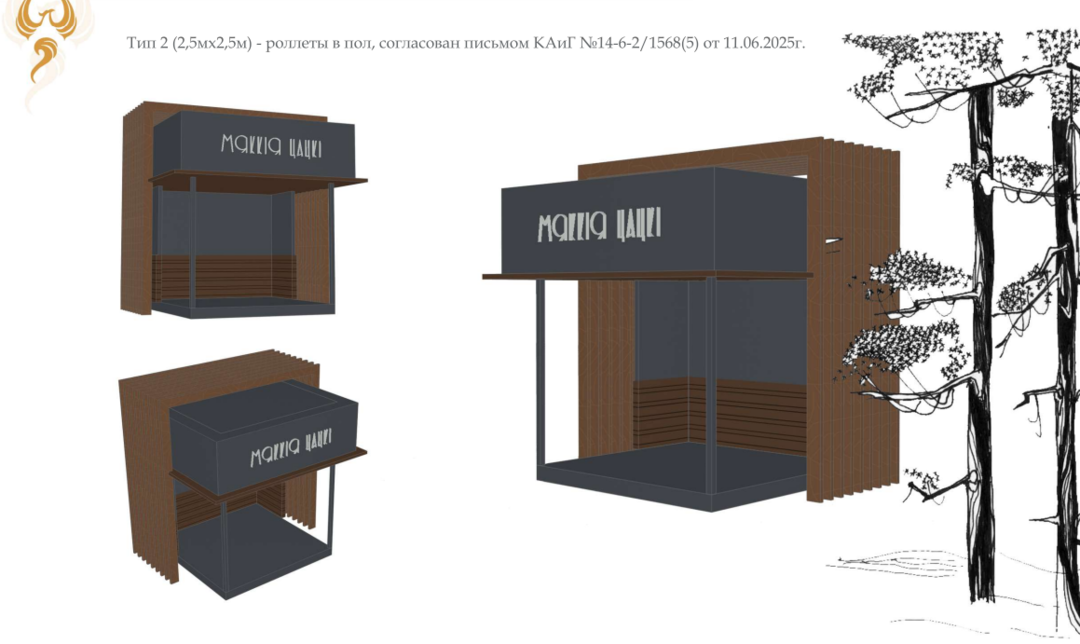 Как отмечается в пояснительной записке, «эскизные решения торговых павильонов разработаны с учетом размещения на территории историко-культурной ценности с применением деревянных элементов, как преобладающего аутентичного материала. Тем самым решается задача скрыть торговлю, без которой не представляется полноценное функционирование современного парка».