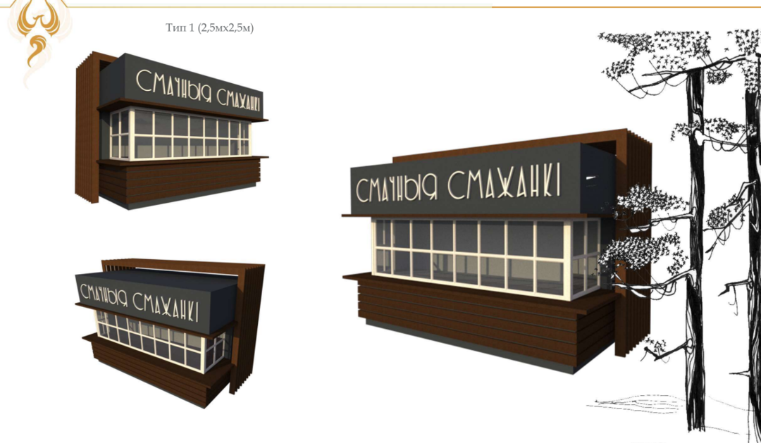 Самое основное — это упорядочение торговых павильонов и нестационарных мини-кафе. Для их размещения выделят сразу несколько площадок. Более того, и кафе, и торговые точки должны быть оформлены в едином стиле. Для небольших кафешек разработали 4 типа павильонов, для торговли — 3 типа. На фасадах новых конструкций будет имитация бруса, а на крыше — мягкая черепица.