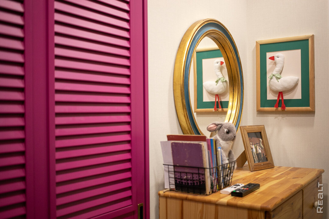 Вторая комната с порога выделяется встроенным реечным малиновым шкафом — огромная мечта хозяйки.