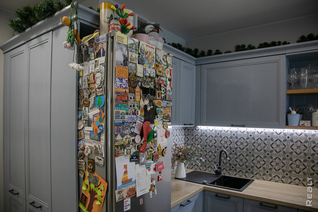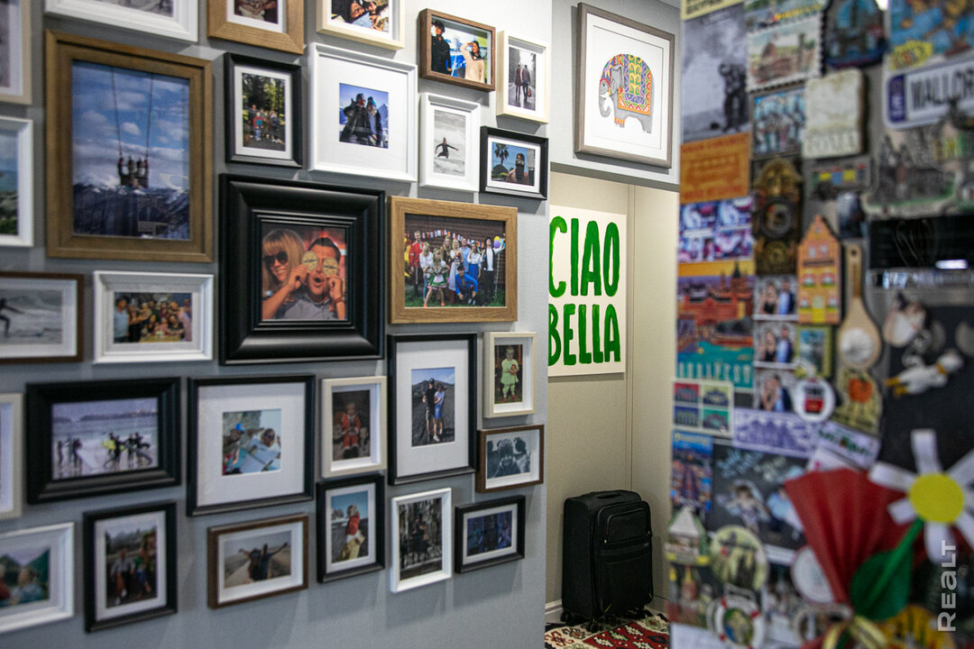 Кусочки мира Лия собирает и на холодильнике. Она не закрывала его фасадами специально, потому что фанатеет от магнитов. Счастливые моменты жизни можно найти в коллаже из фотографий в коридоре. Теперь без рассказов можно узнать об увлечениях всех, кто тут живет.