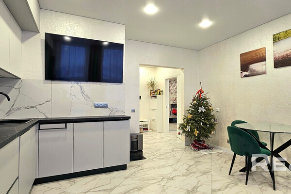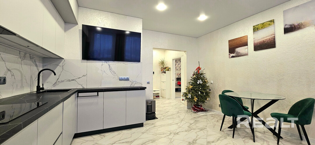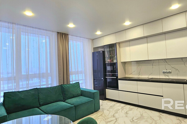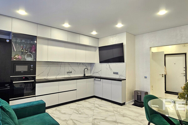 Первый вариант — евродвушка, расположенная на 13-м этаже дома «Маяк». Ее общая площадь составляет 47 квадратных метров. Жилье состоит из кухни-гостиной с двумя большими окнами в пол и отдельной большой спальней с выходом на лоджию. Тут уже установлена встроенная кухня. Стены отделаны венецианской штукатуркой, на полу — плитка и ламинат. Бонусом прилагается машиноместо в крытом паркинге. Стоимость квартиры — 119,5 тысячи долларов (2500 долларов — за метр).