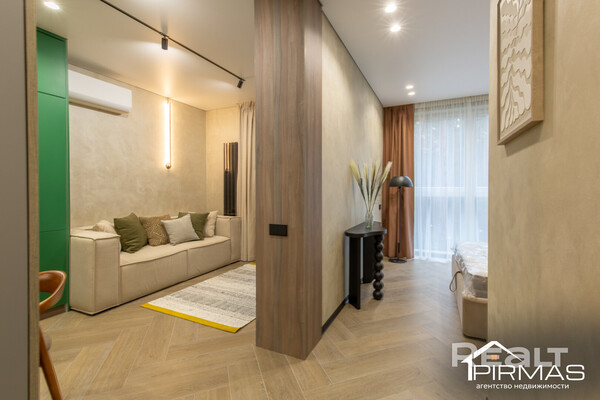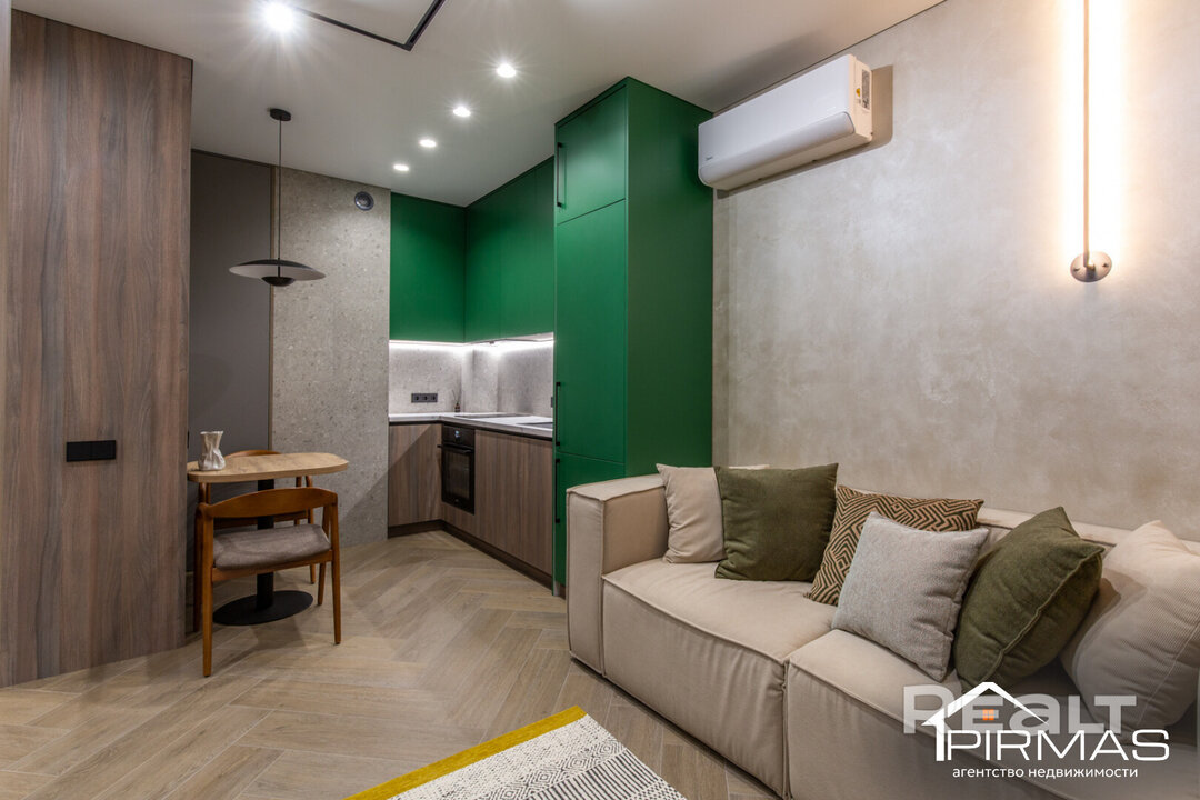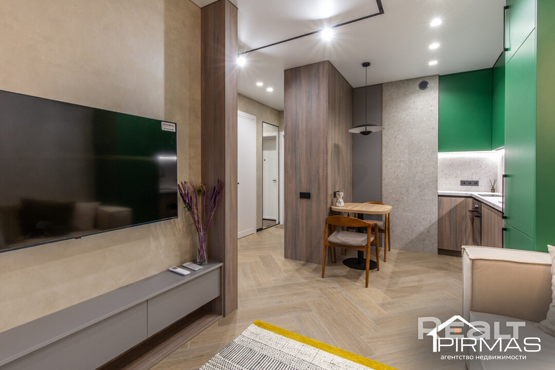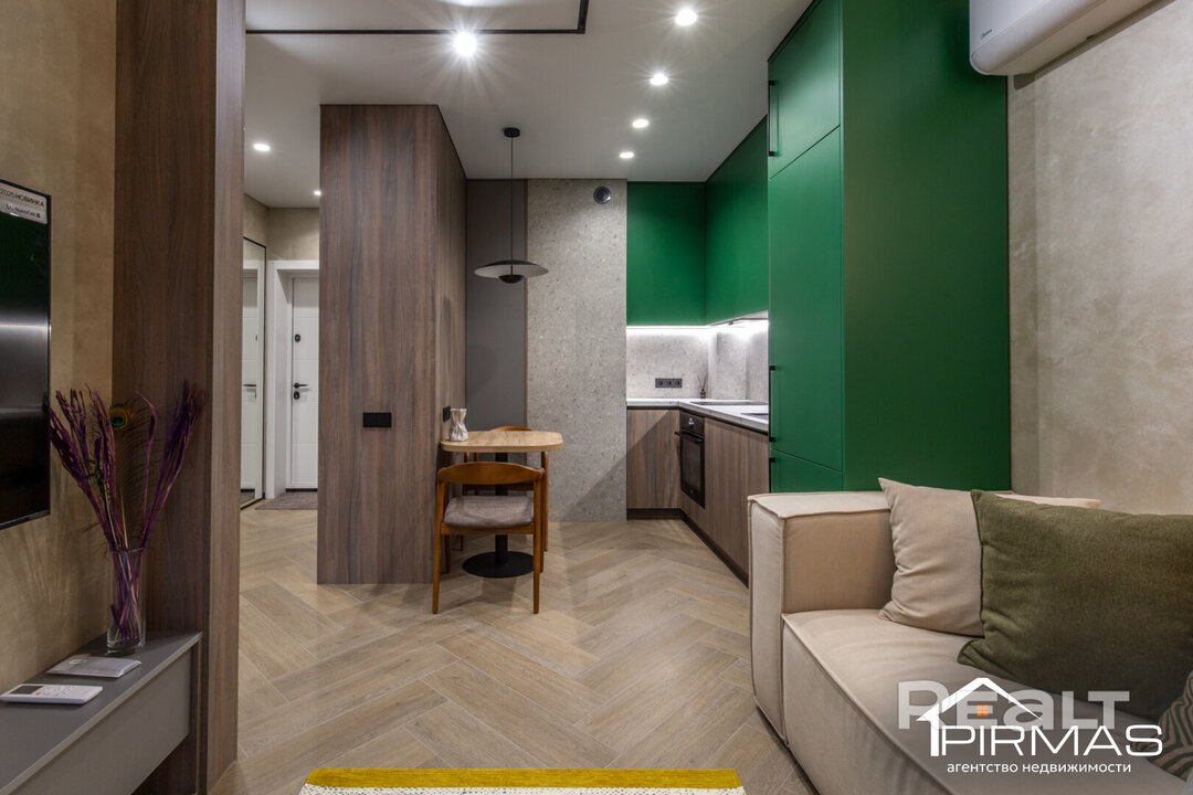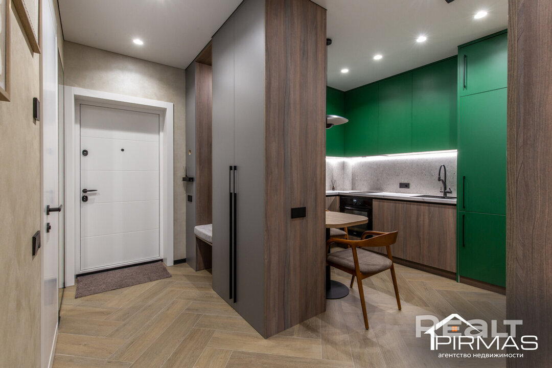 В квартире выполнен стильный ремонт. Базой служат светлые теплые оттенки, а акцентами выступают натуральные материалы и зеленый фасад кухни, который тоже ассоциируется с природой. Стены здесь отделаны декоративной штукатуркой. Потолки — натяжные. На полу лежит плитка.