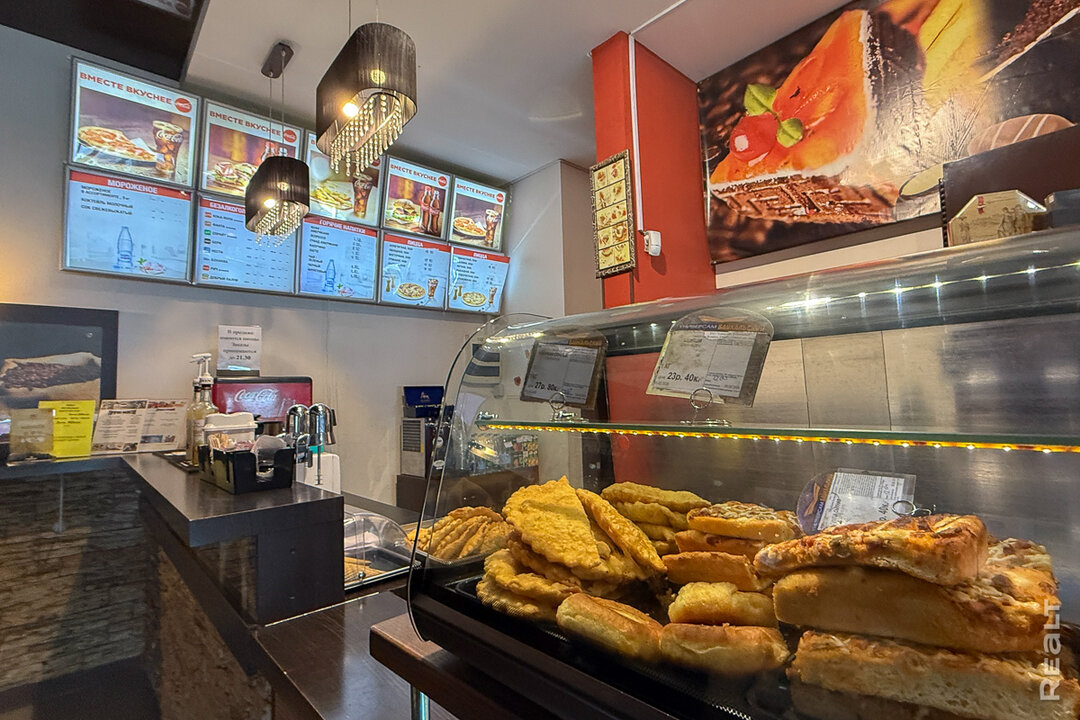Интересно, что в этом же помещении, но в противоположной стороне, есть кафетерий от универсама. Здесь можно на месте перекусить чебуреками, беляшами и пирожками, заказать пиццу — предлагается около десяти вариантов, съесть какой-нибудь десерт. Посадочных мест немного, но посетителей это не останавливает.