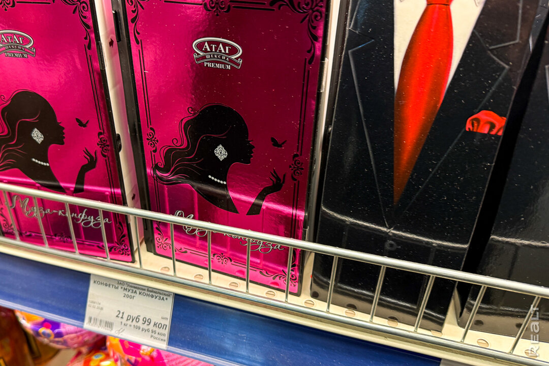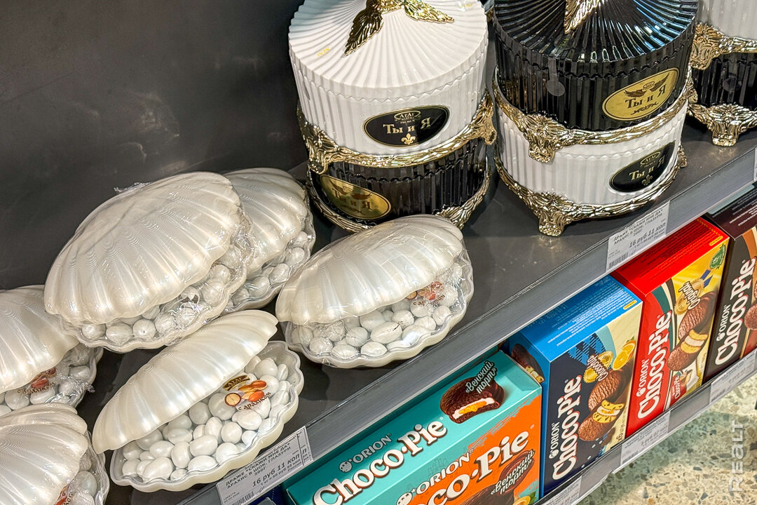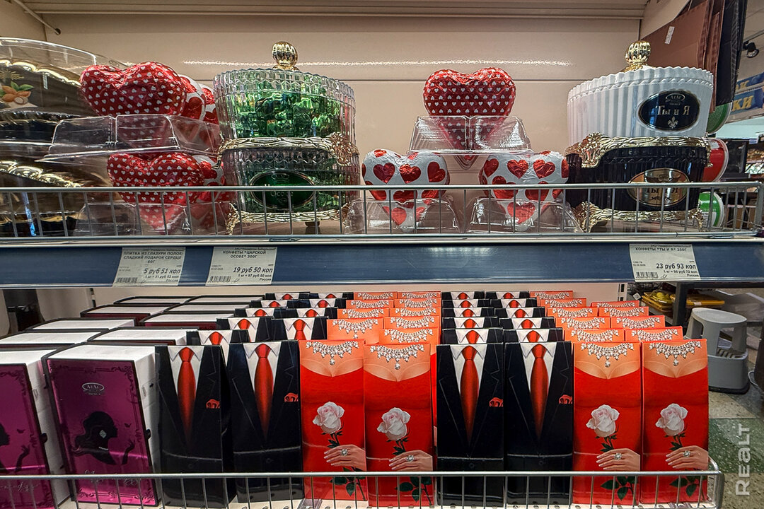 За турникетом на входе нас встречает стенд с товарами, приуроченными к приближающемуся празднику — Дню Святого Валентина. Такое количество красного цвета и сердечек сложно не заметить. Есть и необычные позиции — конфеты в ракушках или шкатулках с поэтичными названиями «Царской особе» или «Ты и я».