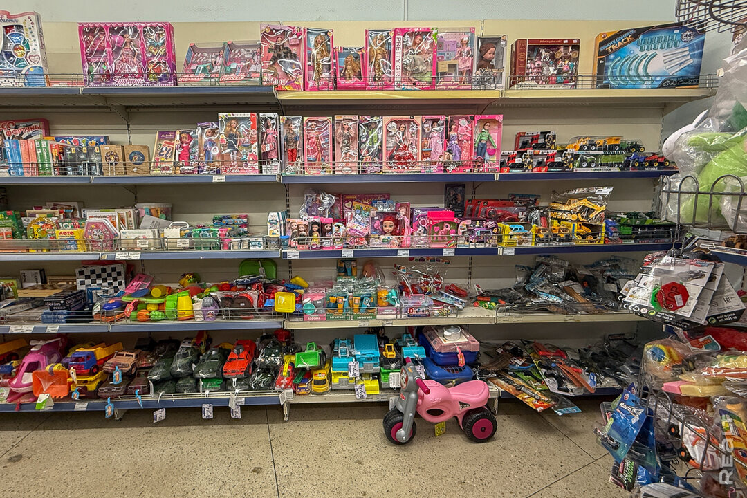 Есть игрушки от белорусского «Полесье», куклы разных возрастов, профессий и размеров, машинки и роботы. В общем, для детей — настоящий рай.