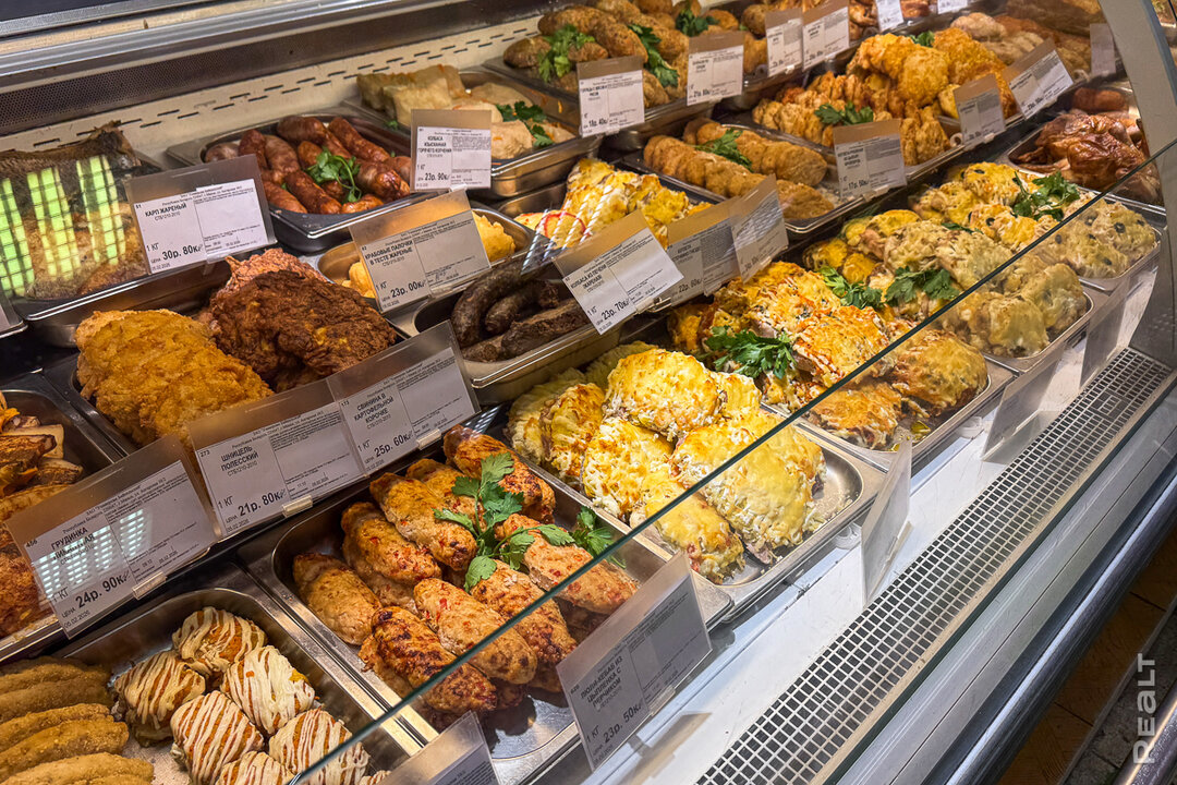 По наводке Екатерины заглядываем в кулинарию. Здесь еще раз на самом видном месте указано, что с 21 до 23 ежедневно предоставляется скидка 10% на собственное производства. Выбрать определенно есть из чего: люля-кебаб из цыпленка с перчиком свинина под шубой, мясо по-домашнему, филе птицы с грибами, овощи, запеченные с сыром, блинчики со свежей капустой, жаркое по-домашнему и много другое. Цены практически такие же, как и везде.