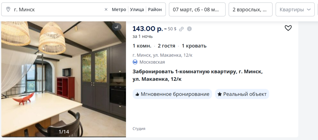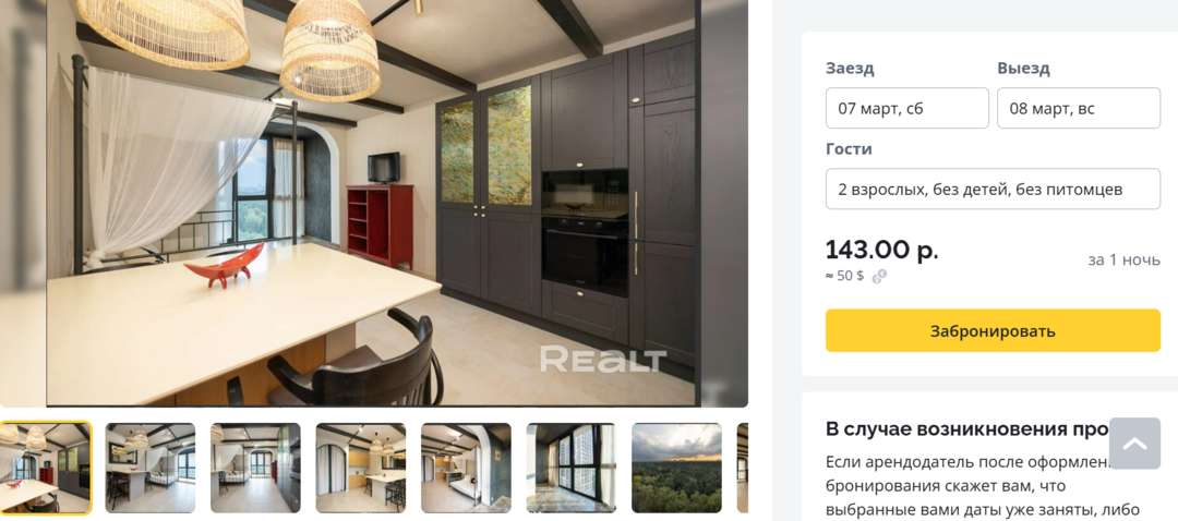 Мы просто вписали в сервисе Realt.Бронь желаемые даты (7−8 марта) для заселения в Минске — и получили множество вариантов квартир на выбор. Конкретно эта квартира привлекла нас симпатичной обстановкой и близостью к главному проспекту, парку и метро. Сутки в такой квартире на выбранную нами дату стоят 143 рубля (около 50 долларов).