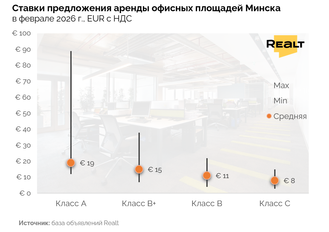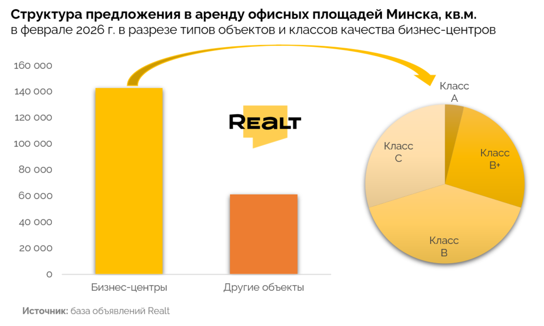 В феврале 2026 года в Минске на выбор арендаторам доступно более 200 тыс. разнообразных офисных площадей в более чем 120 объектах недвижимости. Преобладающая часть из них, как по количеству объектов, так и по объему площадей, приходилась на бизнес-центры — соотношение примерно 4 к 1.