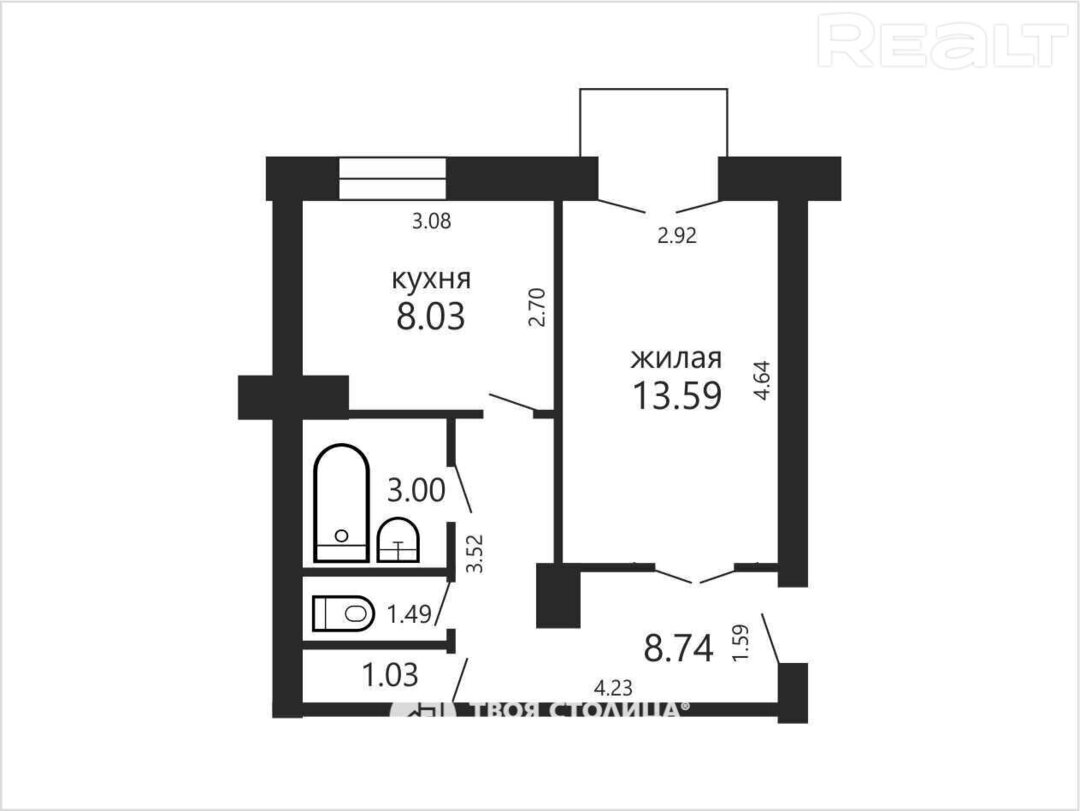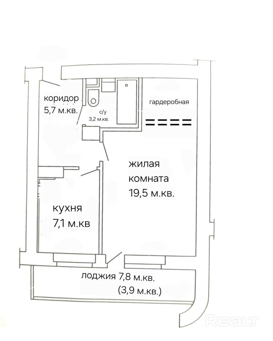 Общая площадь — 44 квадрата, жилая — 20, кухня — 7 метров. Есть застекленная лоджия. А санузел совмещенный.