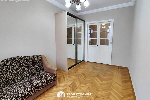 Потолки в квартире трехметровые. В жилой комнате уложен паркет елочкой. Мебели — минимум. Встроенный шкаф-купе и диван. Есть выход на балкон. Окна выходят во двор.