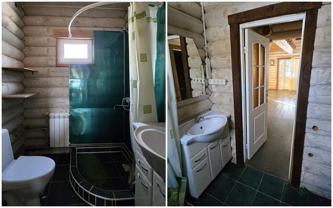 Совмещенный санузел и топочная находятся на первом этаже. В доме сделан душ, установлены бойлер, пеллетный котел, выполнена разводка радиаторов. Вода введена из скважины, канализация — местная (1 колодец, объем 3 куба). Газ в деревне есть, но к дому не подводили.