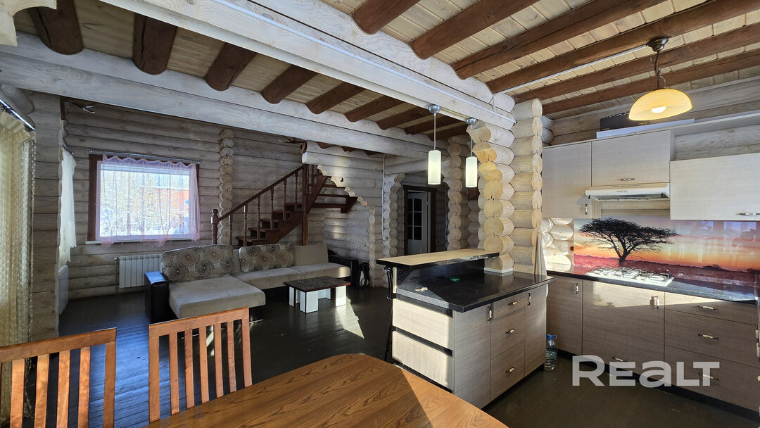 В доме два входа: один из них через террасу. При внутренней отделке не закрывали фактуру дерева. Самая просторная комната на первом этаже — совмещенная кухня-гостиная с гарнитуром, обеденной зоной и бытовой техникой.