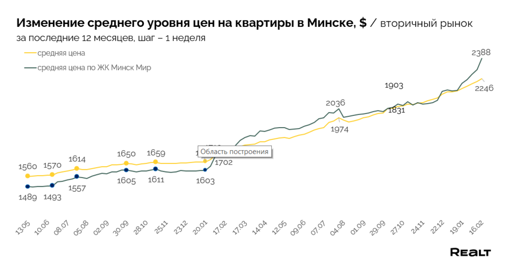 Средняя цена квадрата в объявлениях по всему Минску, за прошедшую неделю увеличилась на 0.9% до уровня 2246 $/м2. А в Минск-Мире прирост составил 3.4% до 2388 $/м2.