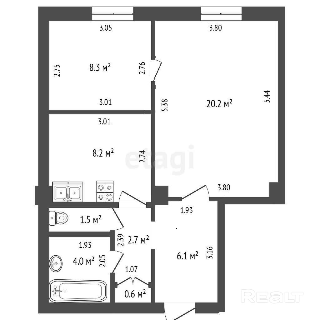 Самая большая квартира подборки — трешка на улице Кузьмы Чорного, 9. Это недалеко от «Академии наук» (около 7 минут пешком) и «Парка Челюскинцев» (меньше 15 минут пешком).