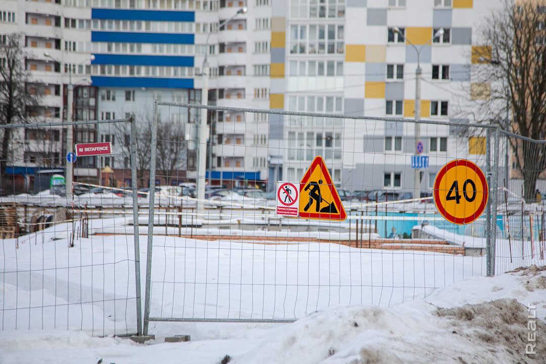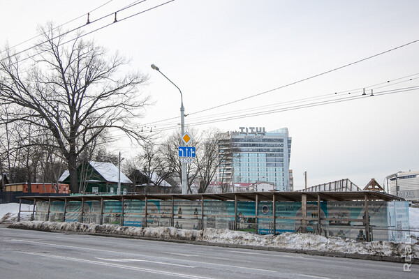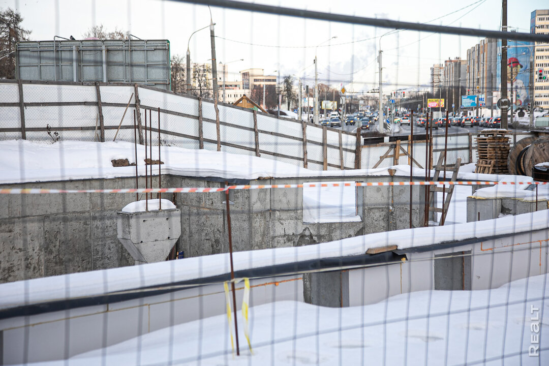 Стройплощадка находится по соседству с многоэтажками и частными домами, а на заднем фоне виден бизнес-центр «Титул» на улице Льва Толстого, железнодорожный вокзал и комплекс «Ворота Минска».