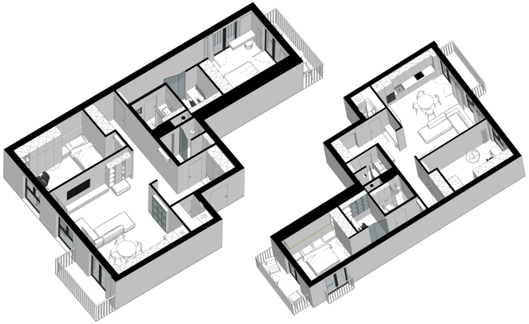 Что касается интерьерных решений для этих двух квартир, здесь Татьяна напоминает: всё индивидуально и проект всегда разрабатывается под запрос. Но если обобщить, эксперт предлагает уйти от стандартной истории с диваном перед телевизором. Заменить это проектором, расположенном, например, в мастер-спальне. А гостиную обустроить для того, чтобы проводить время за общением всей семьей. Это еще и колоссально сэкономит пространство. Ванну предпочтительнее делать в санузле возле спальни, душ — в общем санузле. Хотя бывает и наоборот, особенно если в семье есть маленькие дети и им часто хочется плескаться в ванной.