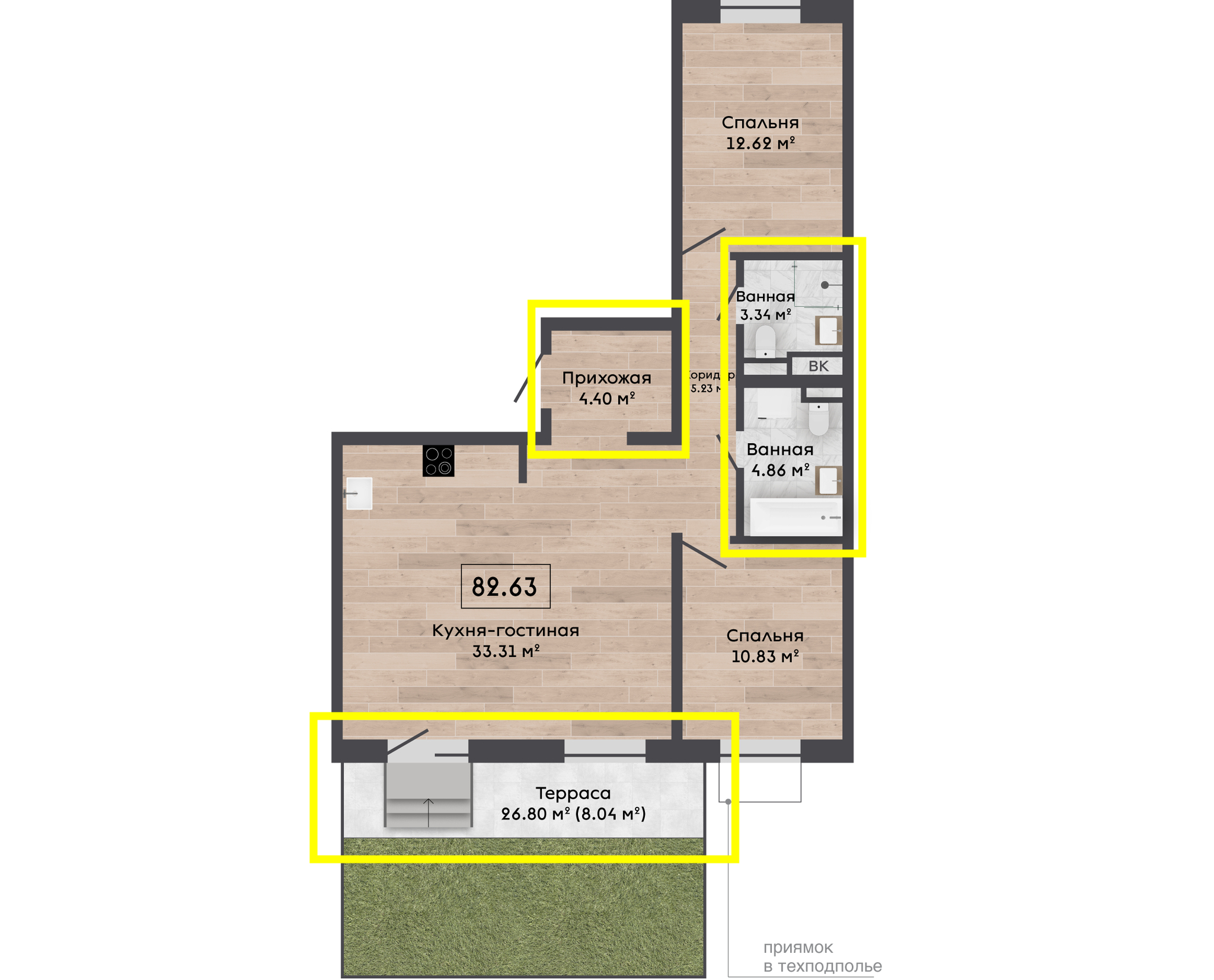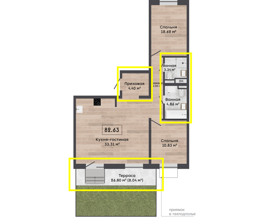 Еще один пример хорошей планировки в Зеленой гавани — квартира площадью 66,9 м², с двумя спальнями и кухней-гостиной на 22,57 м².