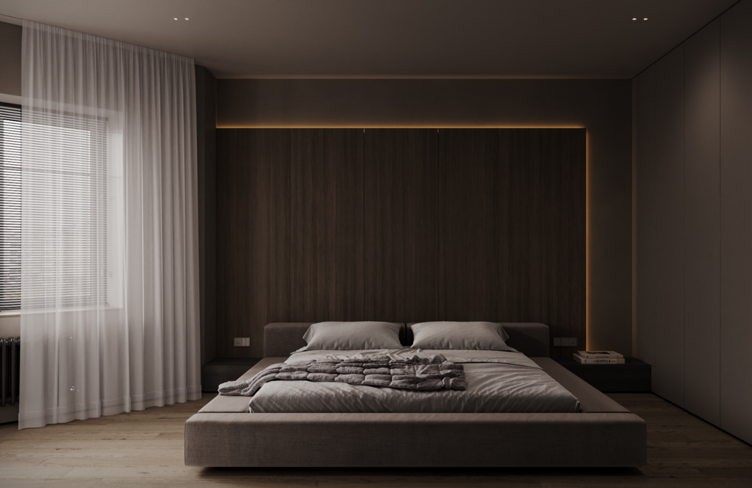 Кровать в спальне расположили классически. Уголок, где расположено кресло, с появлением ребенка можно будет трансформировать — и поставить кроватку.