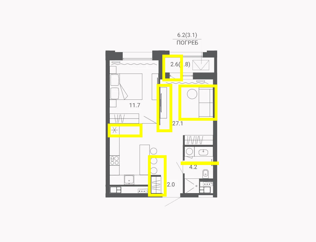 — Это очень хороший вариант, в котором можно сделать отличную перепланировку. Поменять местами кухню с гостиной, сделать кухню с небольшим поворотом. Поставить небольшой угловой диван, развернуть барную стойку. Есть опция разделить санузел — на маленький гостевой и побольше. При желании мы можем увеличивать жилую площадь за счет санузла (не более чем на 25%). То есть, можно сделать там небольшую душевую, например, санузел, раковину. В гостевом санузле — нишу под стиральную машину, как раз там, где у застройщика нарисован душ. А если утеплить балкон, повесить там кондиционер, можно обустроить небольшое рабочее место. Получится отличное жилье для семьи из двух человек, будет удобно и с ребенком до трех лет.