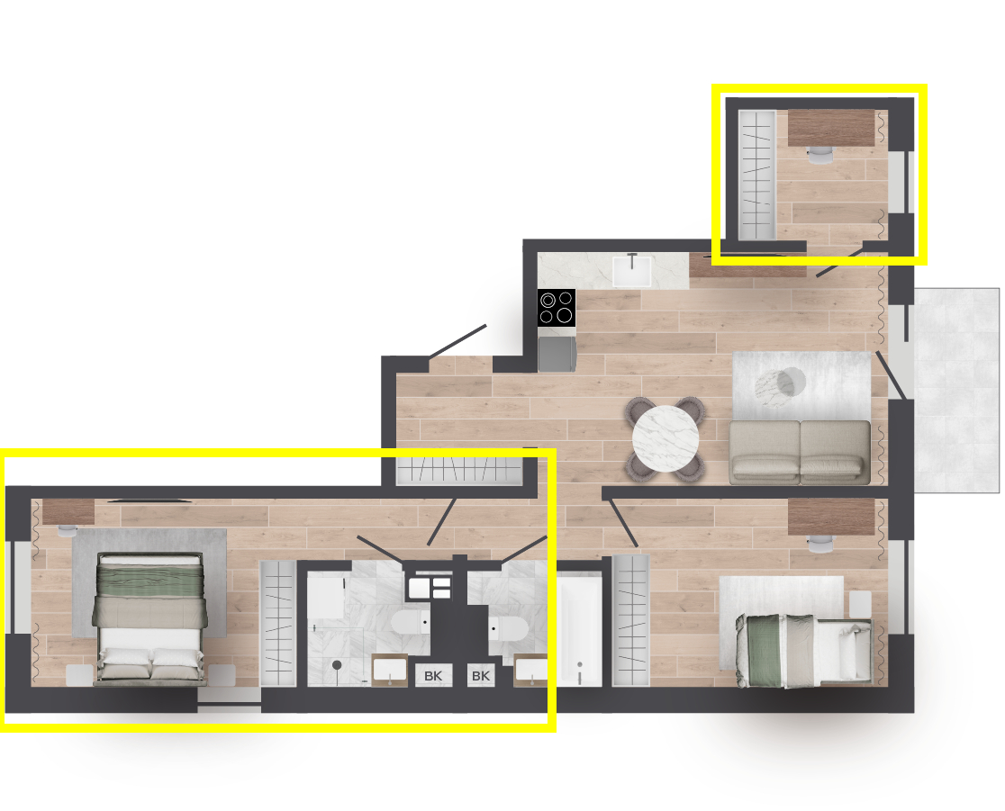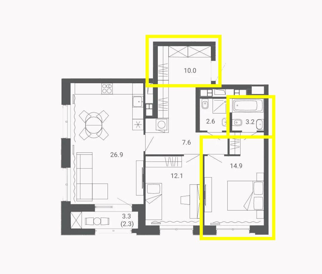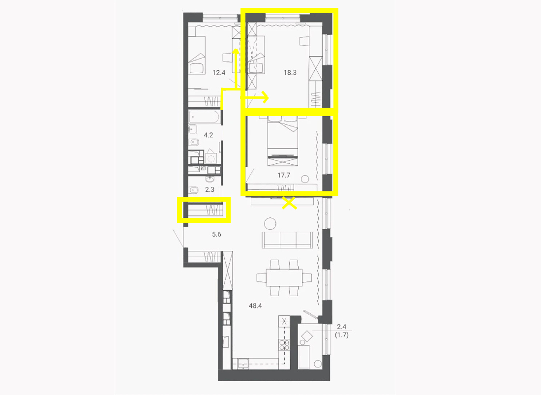 — Здесь много места, но это еще не всё. Один из огромных плюсов — возможность классно увеличить гостиную за счет детской на 18,3 м². Помещение на 12,4 м² можно превратить в кабинет. Или же в зоне предполагаемой кухни сделать кабинет, а саму кухню вынести в гостиную. Также будет удобно перенести постирочный блок в гостевой санузел. Так увеличится площадь основной ванной комнаты, куда в итоге поместятся и ванна, и душевая. В общем, это замечательная планировка с большим пространством для творчества.