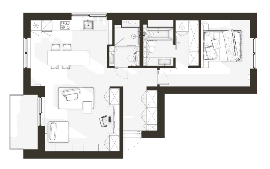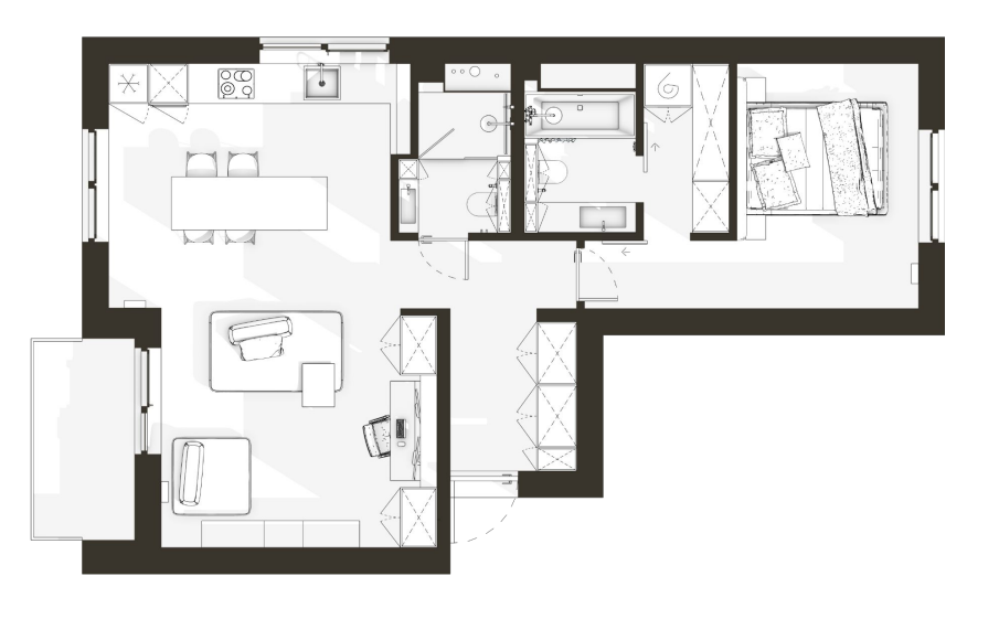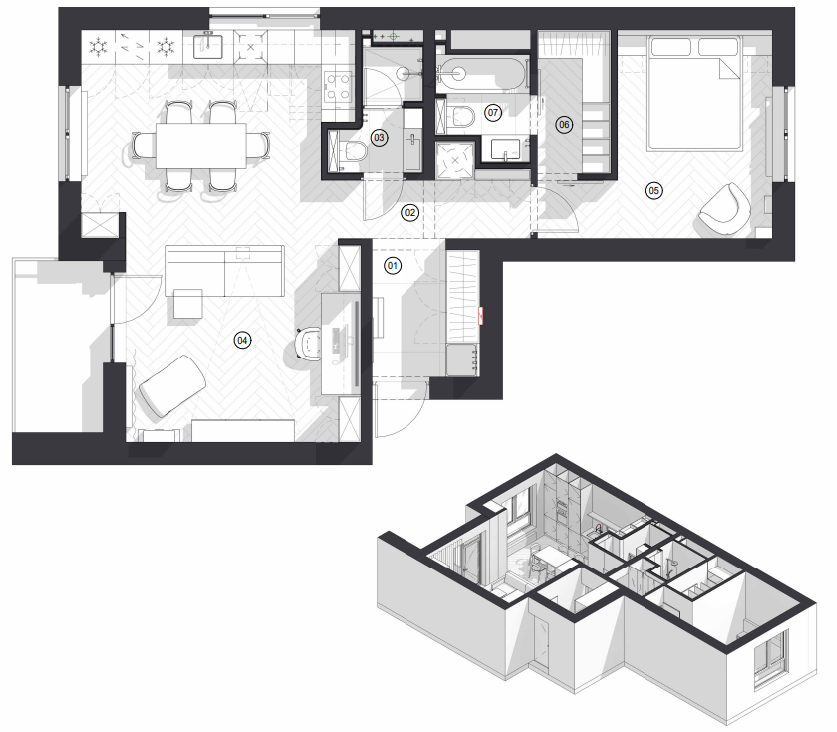 — Перепланировка и ключевая зона — мастер-блок, объединяющий небольшую уютную спальню, ванную, гардеробную / систему хранения, постирочную, технические коммуникации. Проход из спальни в гардеробную, а затем в ванную. Выбор раздвижных дверей, которые экономят пространство и минимизируют конфликты. В плане сантехники — инсталляции, подвесные элементы. Для хранения сезонной одежды большой шкаф в прихожей и кладовая на цоколе.