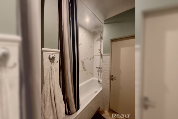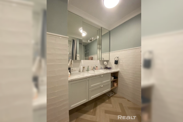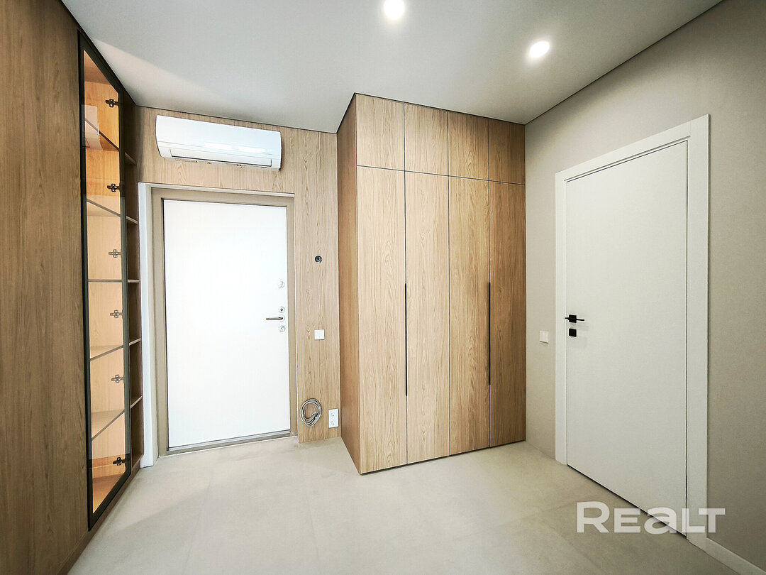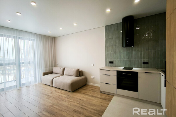 Общая площадь квартиры — 46 метров, а на жилую приходится 31 квадрат. В гостиной, совмещенной с кухней, большое окно во всю стену. Стены выравнены и окрашены, на полу в комнатах дубовый паркет, а вдоль рабочей зоны кухни — плитка с подогревом. Установлен кондиционер.