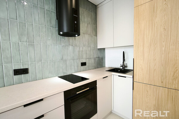 В кухонной зоне фартук выполнен в акцентном изумрудном цвете. Из техники есть посудомоечная машина, духовой шкаф, варочная панель и вытяжка.