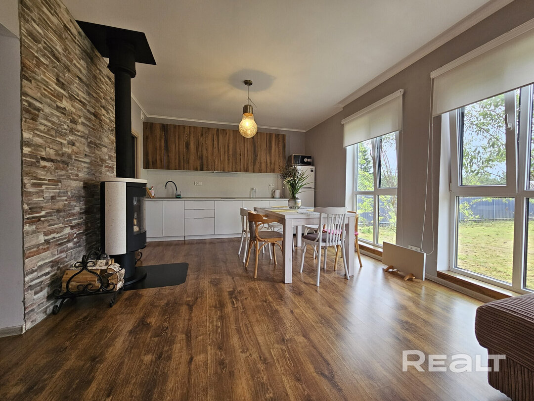 1509За Смолевичами нашли бревенчатый современный дом с панорамными окнами. Несмотря на то, что рядом есть соседи, с участка открывается живописный вид на лес и поля. Дом можно использовать для круглогодичного проживания: есть коммуникации, две спальни, а до Минска — 40 км. Показываем этот вариант.