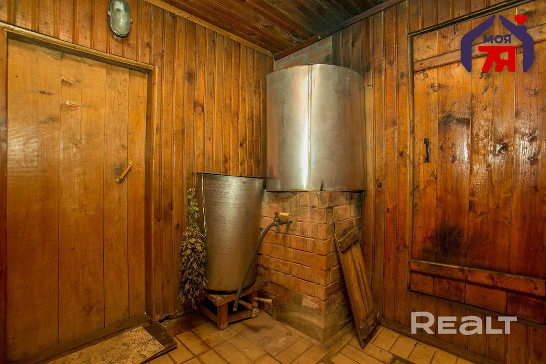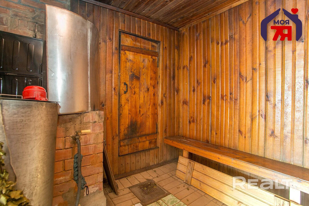 Ванную комнату заменяет отдельная баня. Рядом имеются гараж с жилой площадью на втором этаже, погреб и сарай. Достанется покупателю и садовый инвентарь: триммеры, газонокосилка и культиватор.