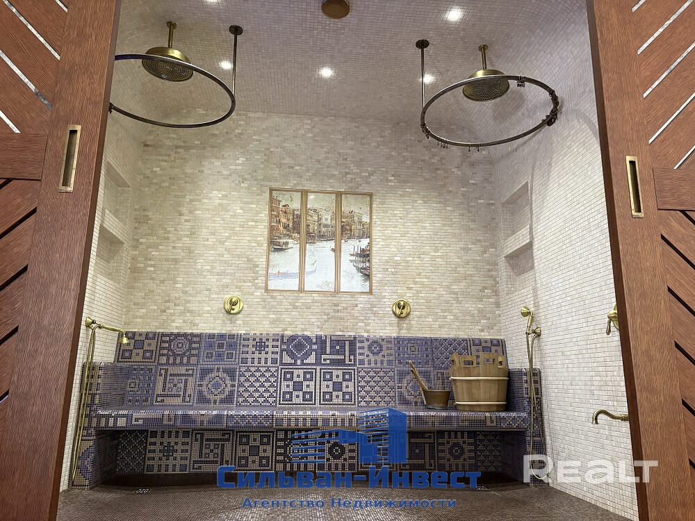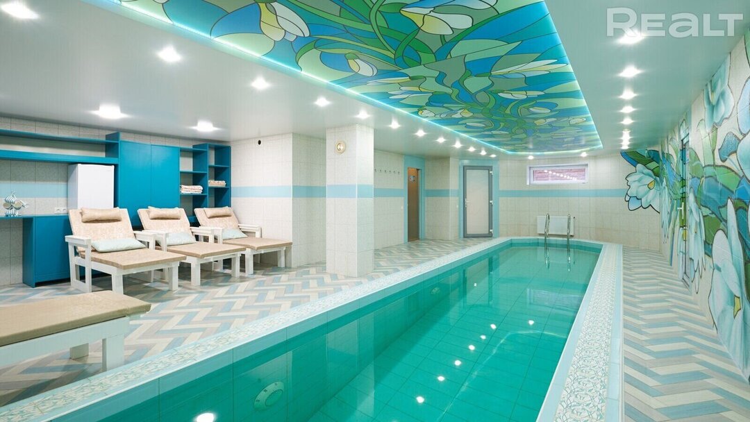 На участке 21 сотки находится еще одно строение — на 250 квадратов: с бассейном, баней, кухней, комнатой отдыха и террасой.