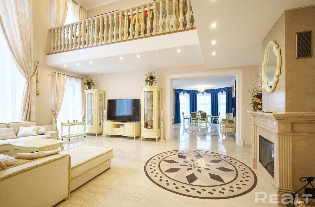На этой же улице есть особняк подороже — за 1 750 000 долларов. Это строение солидных размеров, с цокольным этажом — общая площадь 500 квадратов. Стены как в крепости — кирпич, толщина 65 см. Перекрытия монолитные, высота потолков — от 3,25 до 6,5 метров. Крыша — утеплённая, с отдельным мансардным этажом, покрыта немецкой керамической черепицей. В отделке все дорого-богато: мрамор, итальянские плитка, камины, мебель и сантехника. Две шикарные лестницы имеют изысканное балюстрадное ограждение из художественного французского литья.