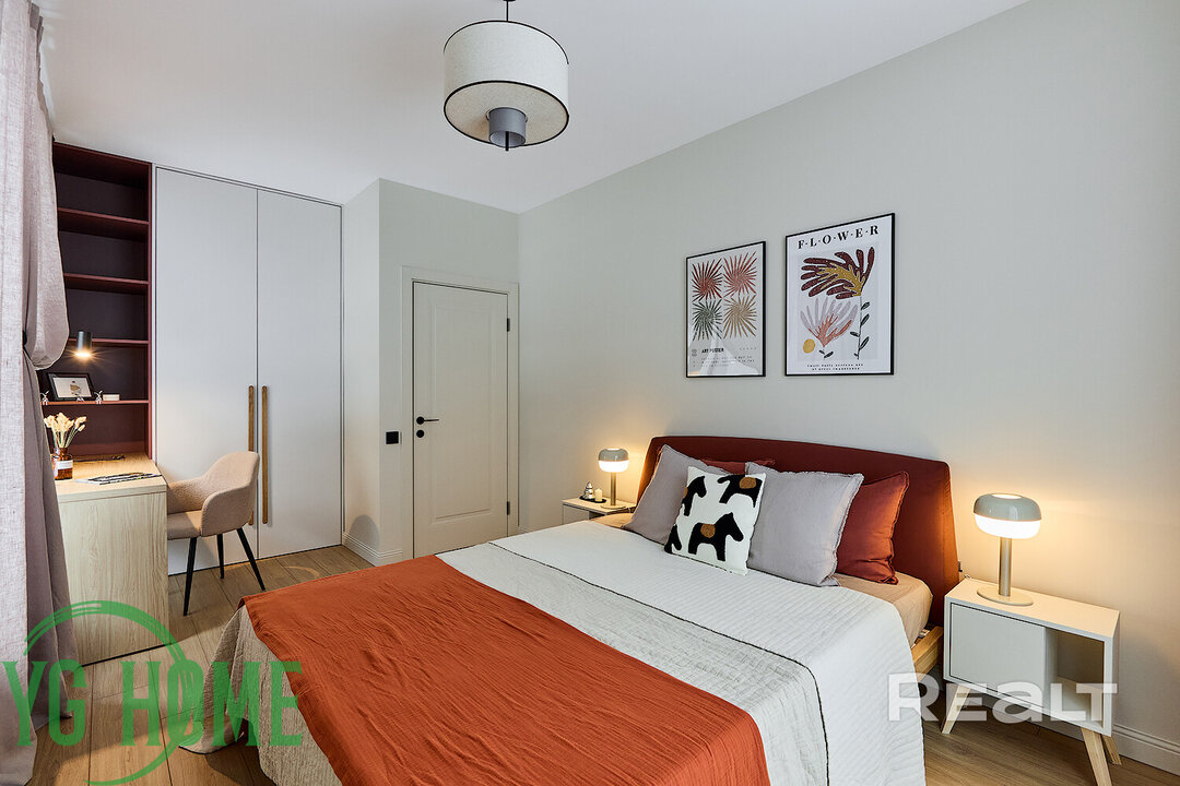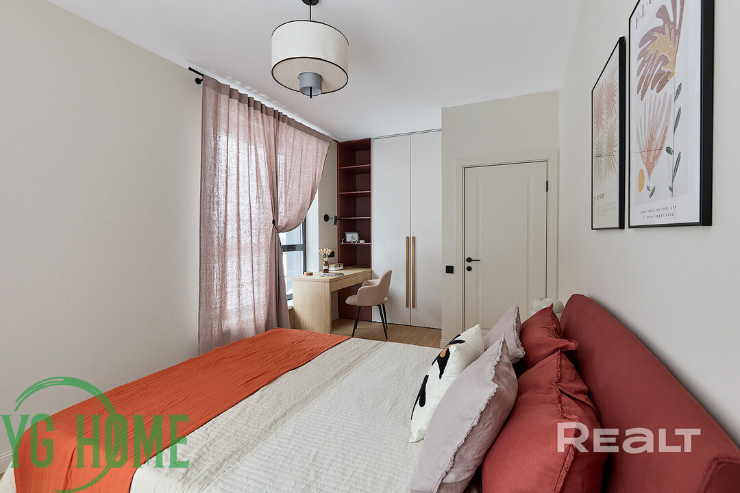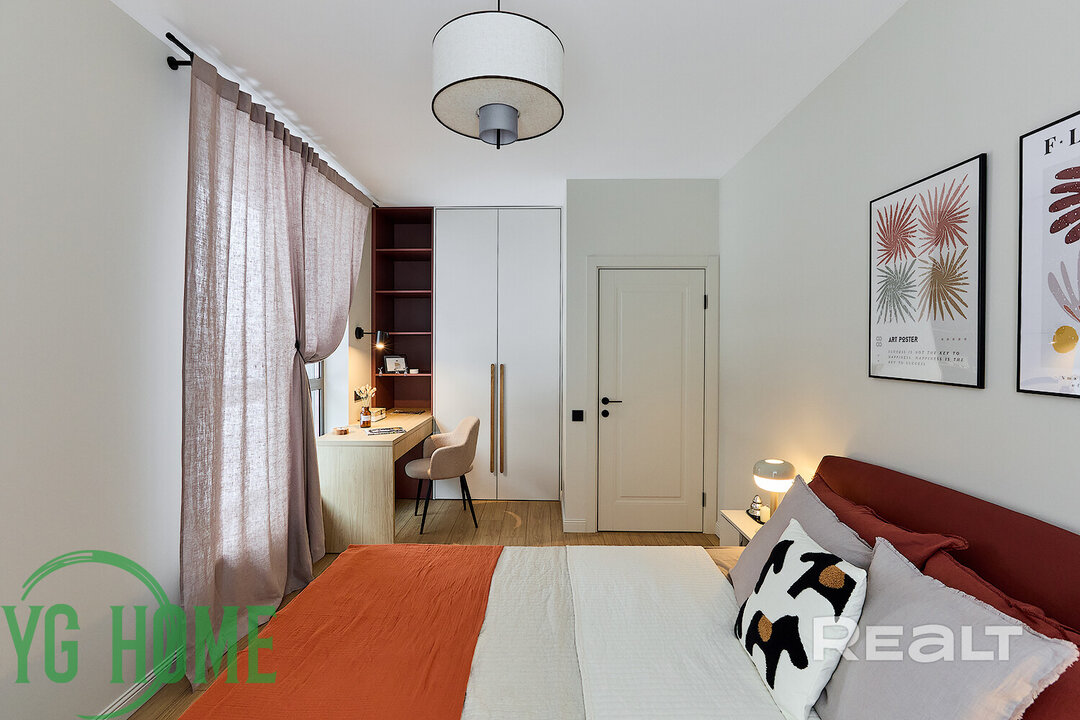 В светлой спальне удалось выделить рабочее место. Здесь же есть шкаф для вещей.