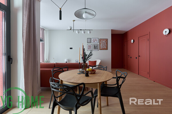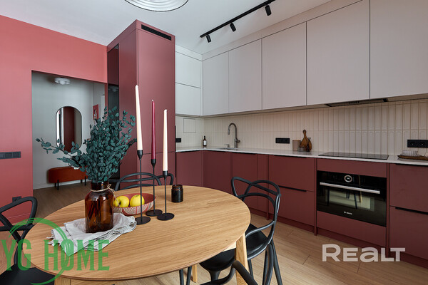 В кухне-гостиной обустроена столовая. В квартире продумано несколько сценариев освещения. Установлена и бытовая техника бренда Bosch: посудомойка, стиральная машина с функцией сушки, духовой шкаф с режимами микроволновки. Холодильник тут встроенный.