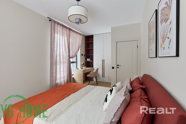 798В этой евродвушке не станет скучно из-за ярких фасадов кухни и стен, даже балкон тут нетипичного цвета. Кроме этого, жилье готово к проживанию — обставлено хорошей техникой и мебелью. Два окна в спальне позволили организовать там рабочее место. Посмотрите, как все удалось обустроить. Цена в конце.