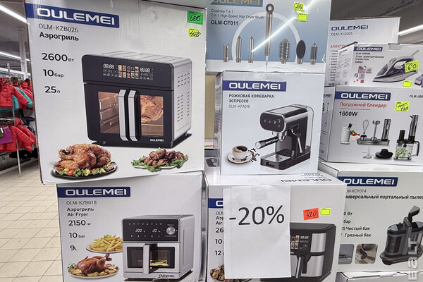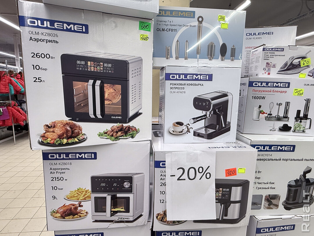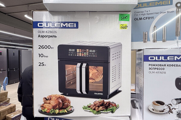 В магазине продаются новые товары, витринные образцы и товары, бывшие в употреблении. Многое — в заводской упаковке. Начнем с позиций, на которые предлагают скидки. Так, например, аэрогрили белорусского бренда Evolution можно купить за 260 и 340 рублей в зависимости от модели. На технику китайского бренда OULEMEI предлагают скидку 20% (от стоимости, по которой раньше продавалась в этом магазине). Есть аэрогрили, рожковые кофеварки, блендеры, утюги, пылесосы.