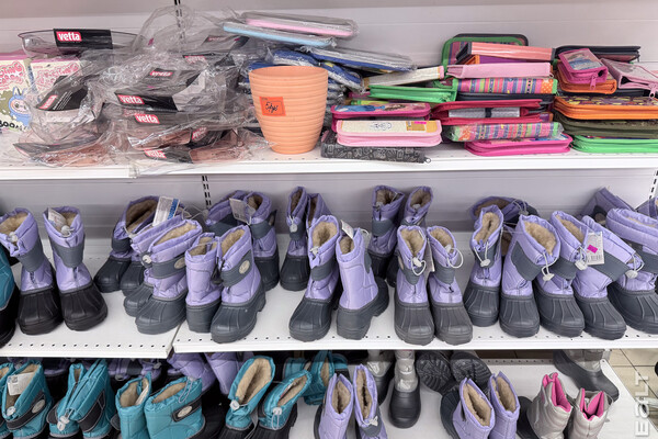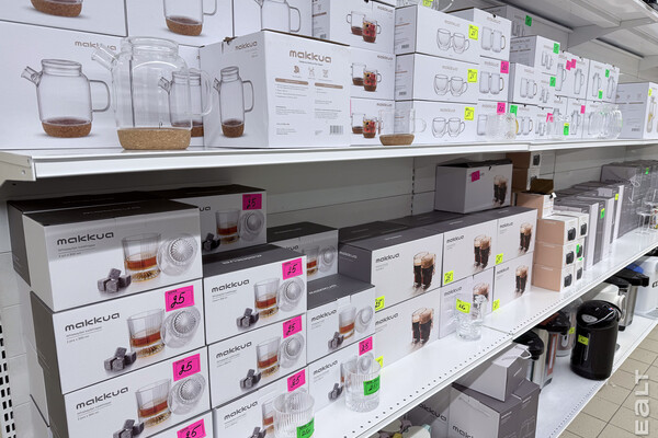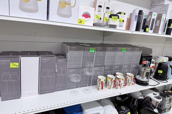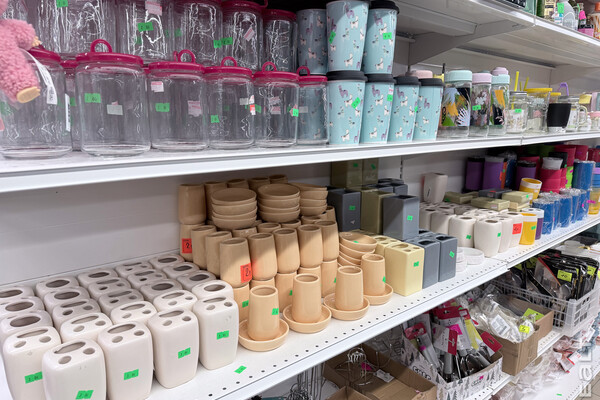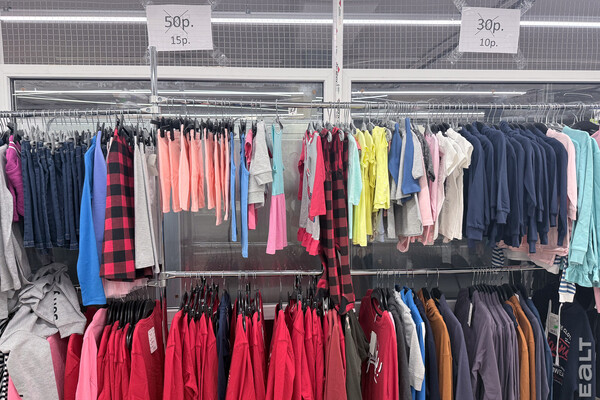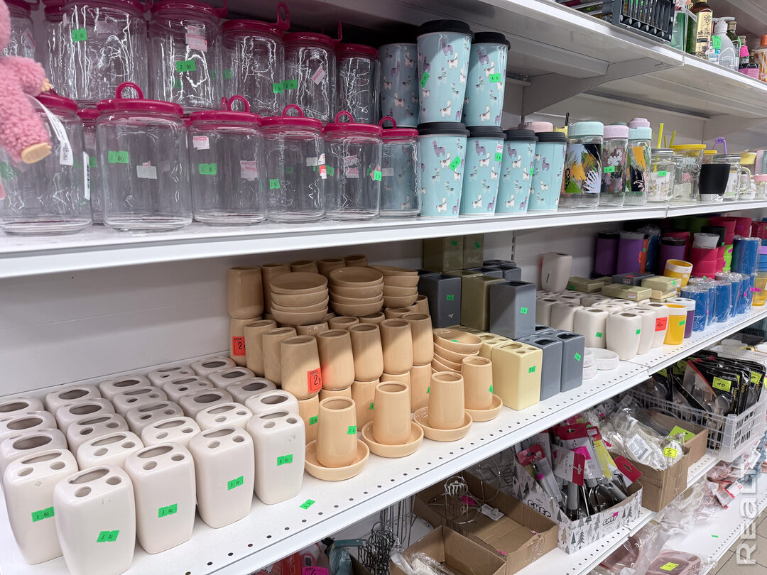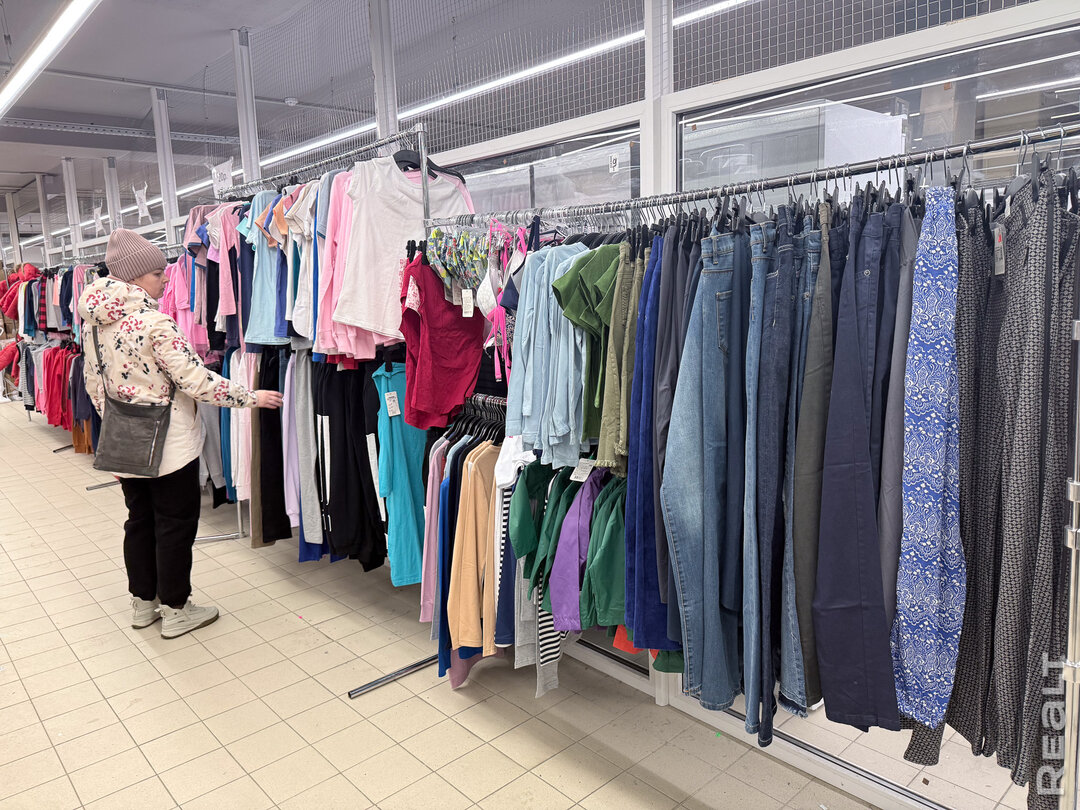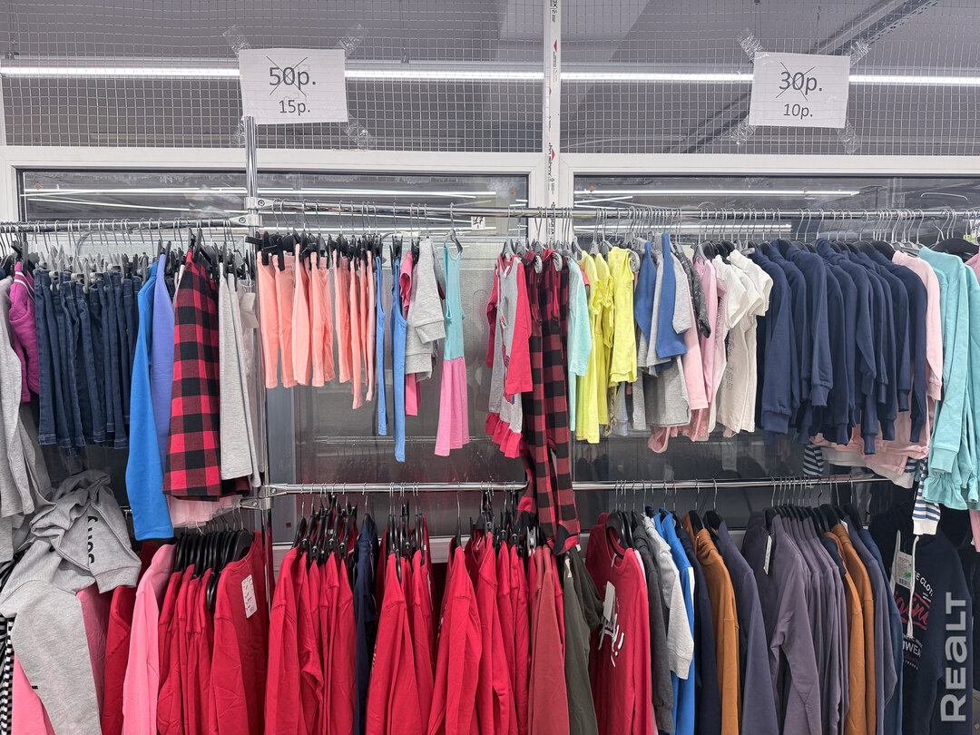 Есть несколько стоек с дешевой одеждой, детская обувь и мелочи, посуда и товары для декора.
