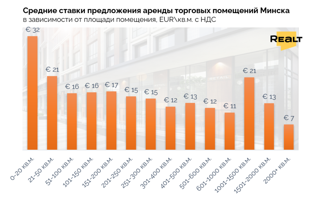 - стрит‑ритейл в жилых районах: от 15 € до 21 € за кв.м. с НДС;